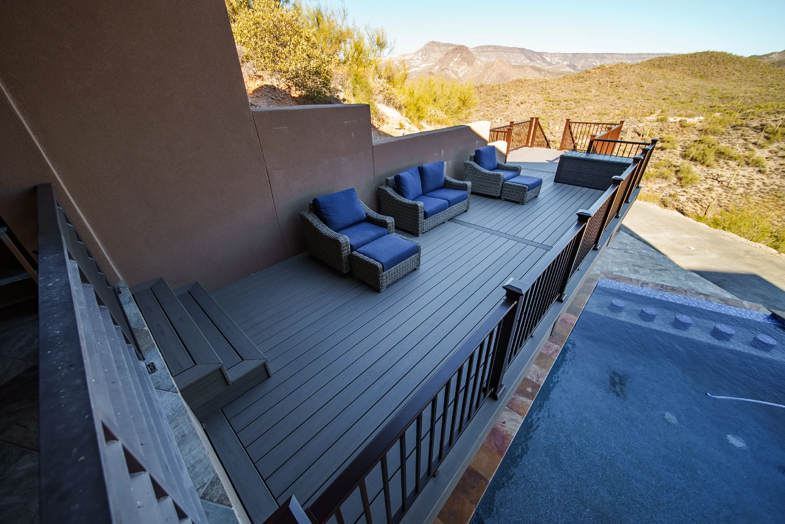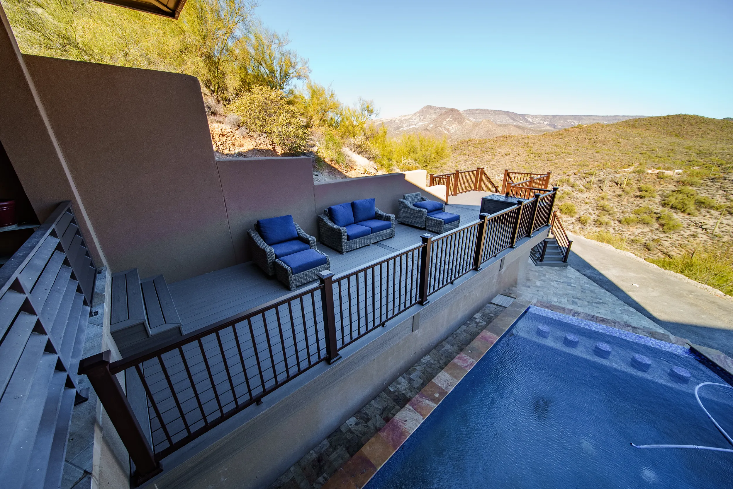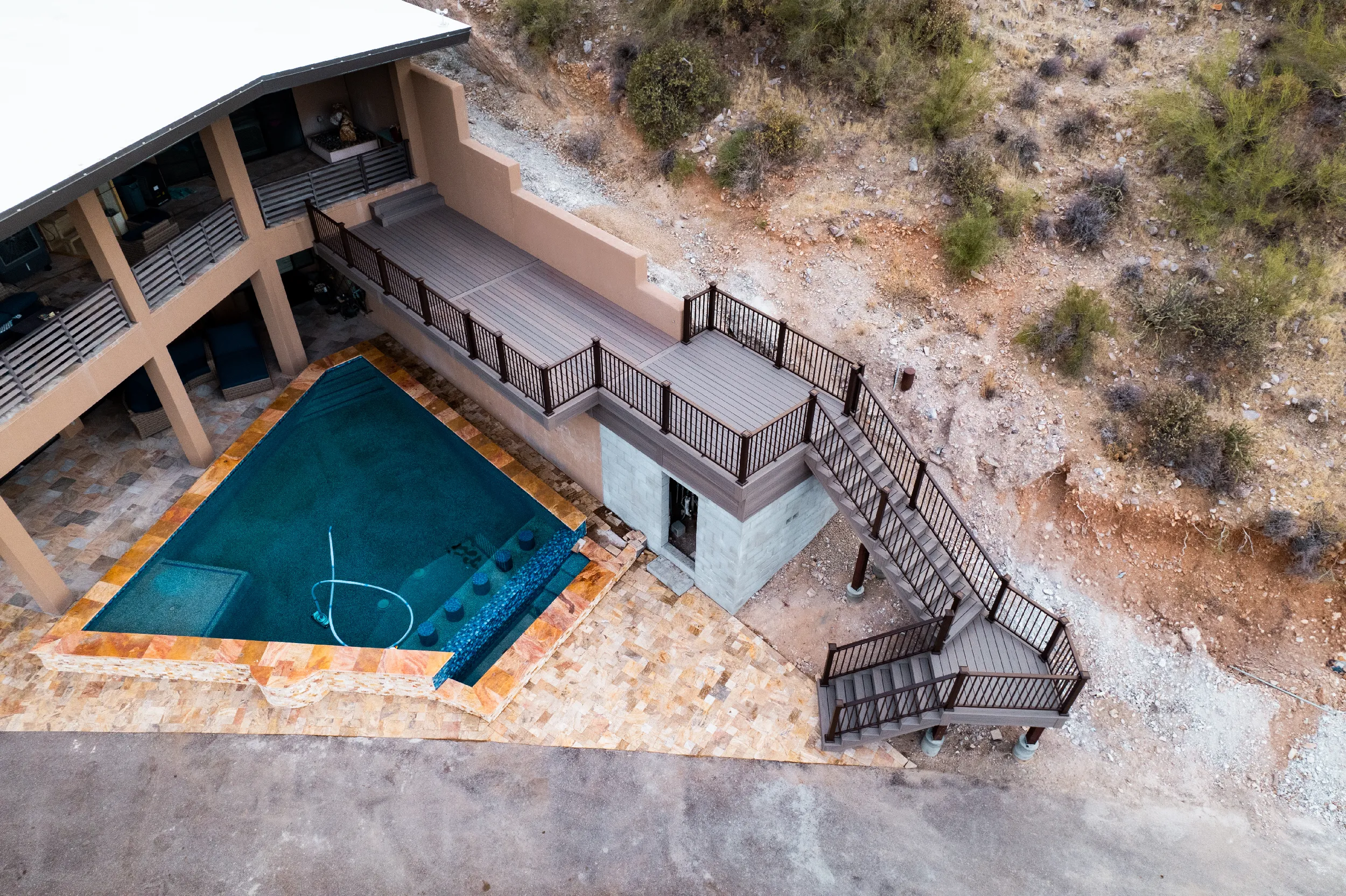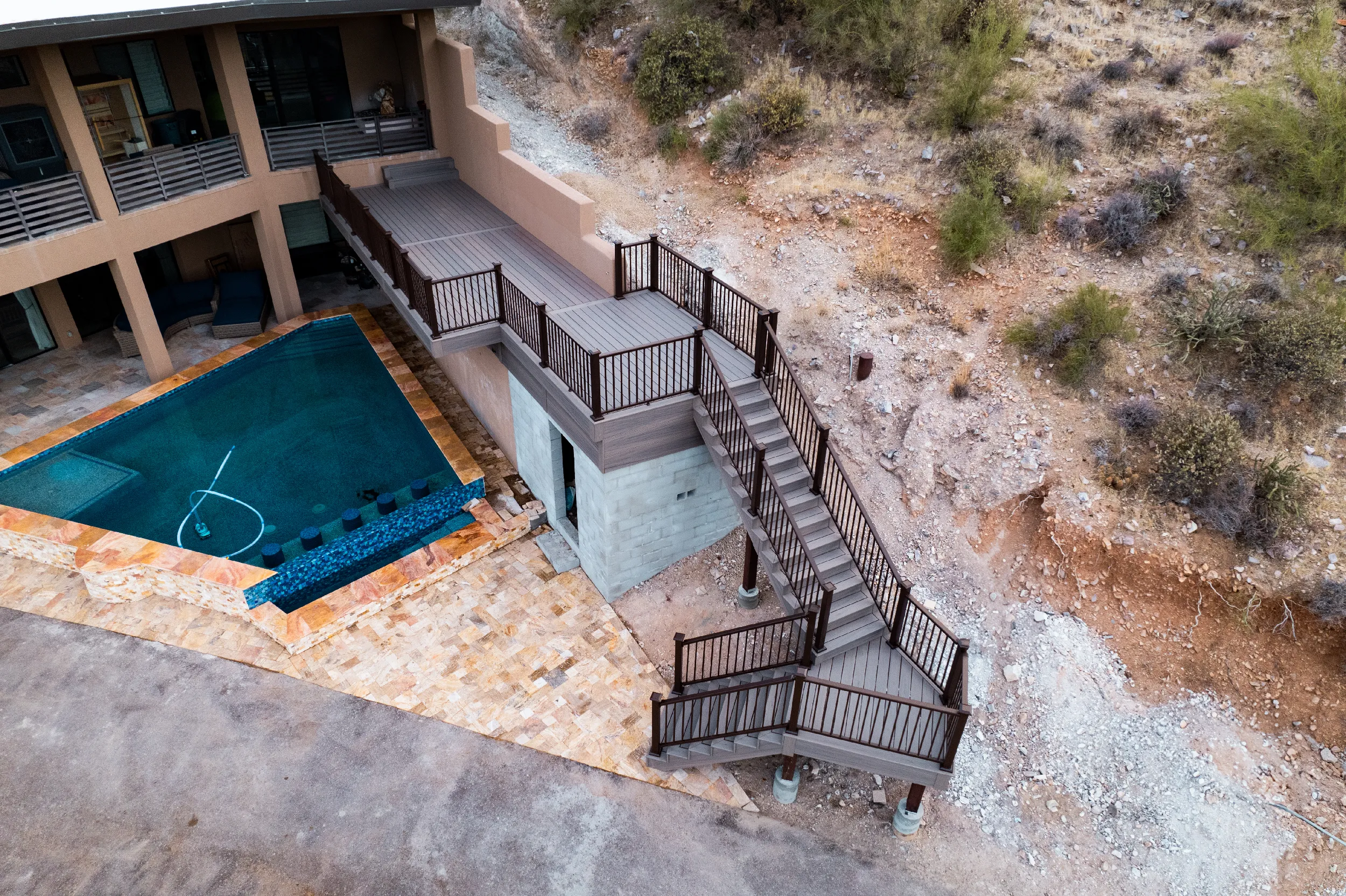 Located high atop a Cave Creek mountain, Christy and Joe wanted a deck that would not only provide 360 views of the surrounding natural beauty, but also provide below deck storage for all their outdoor needs and serve as a poolside deck overlooking their newly built, waterfall pool.