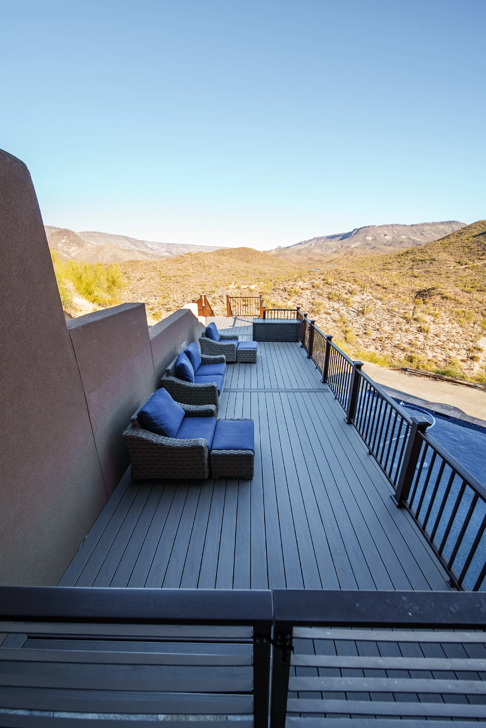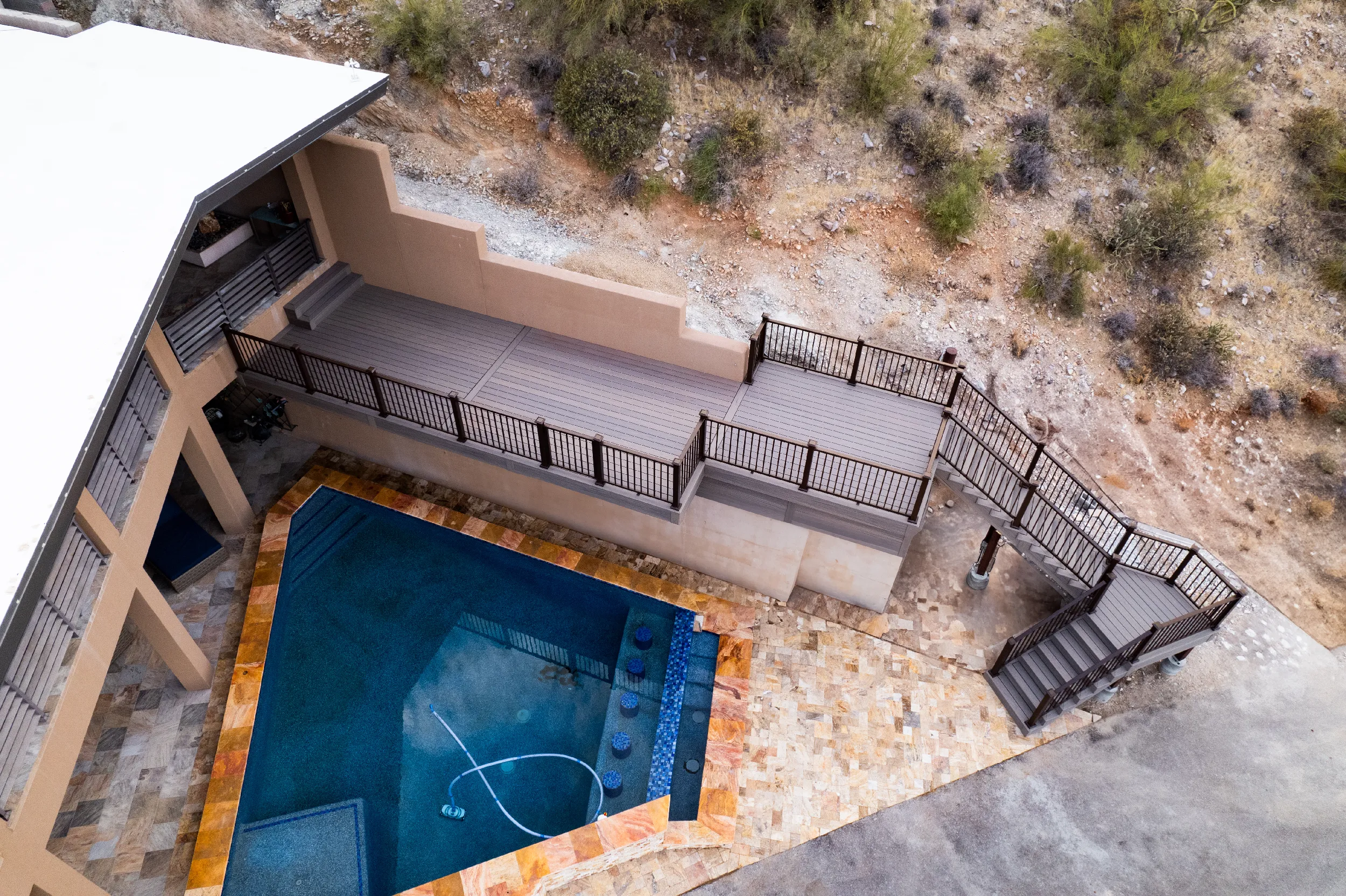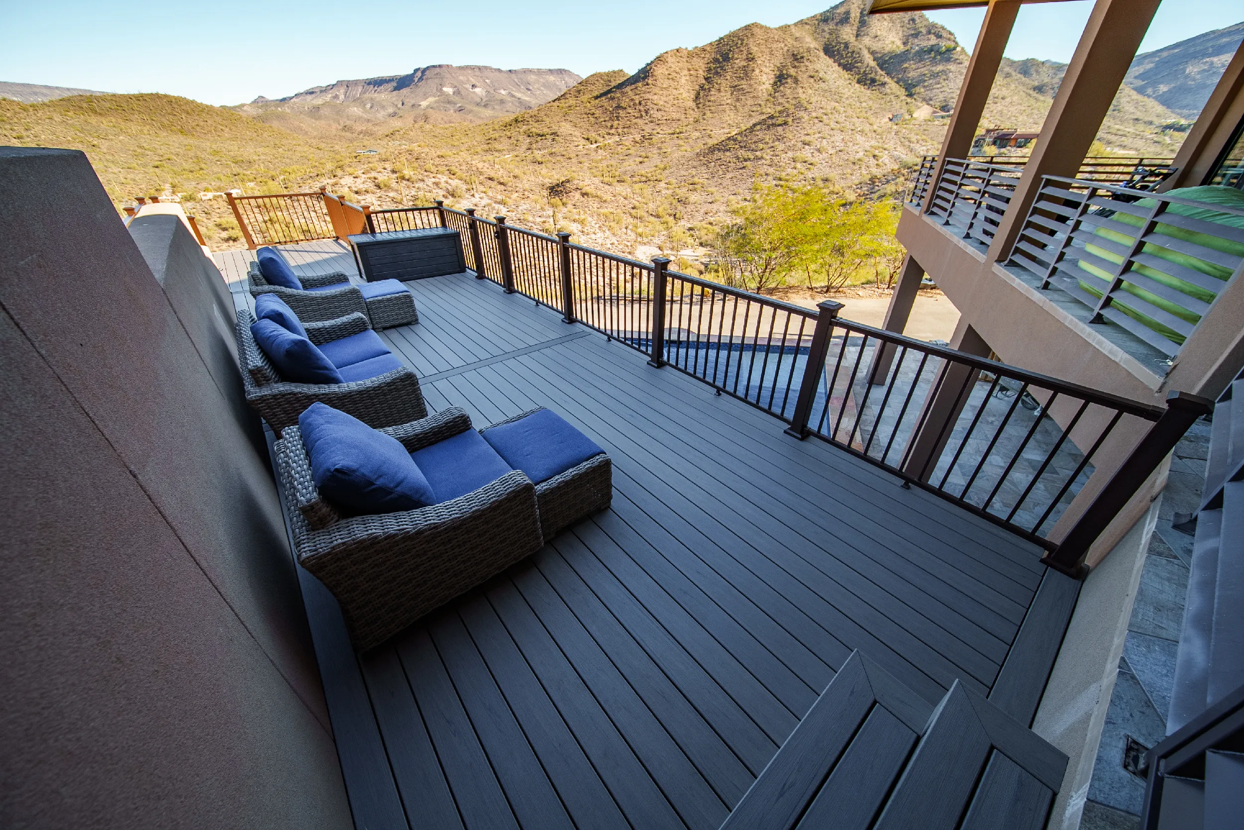 Located high atop a Cave Creek mountain, Christy and Joe wanted a deck that would not only provide 360 views of the surrounding natural beauty, but also provide below deck storage for all their outdoor needs and serve as a poolside deck overlooking their newly built, waterfall pool.