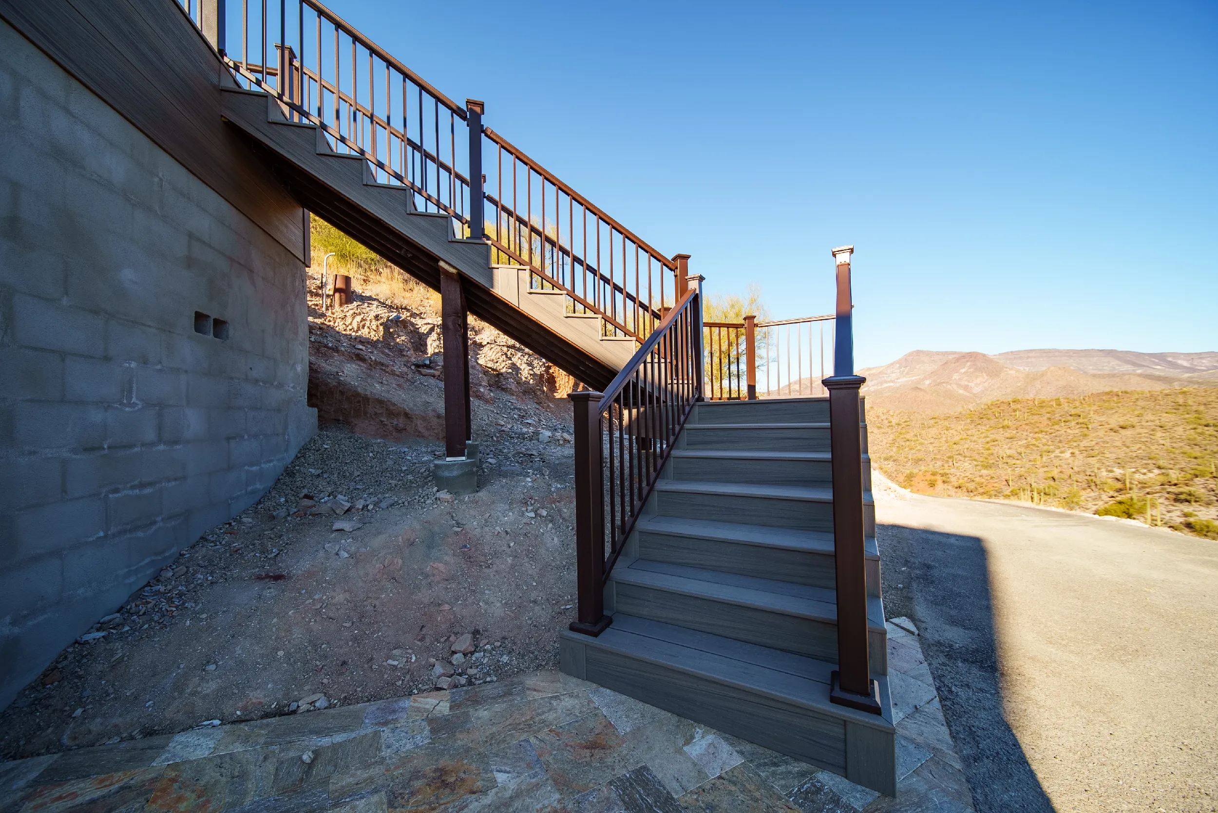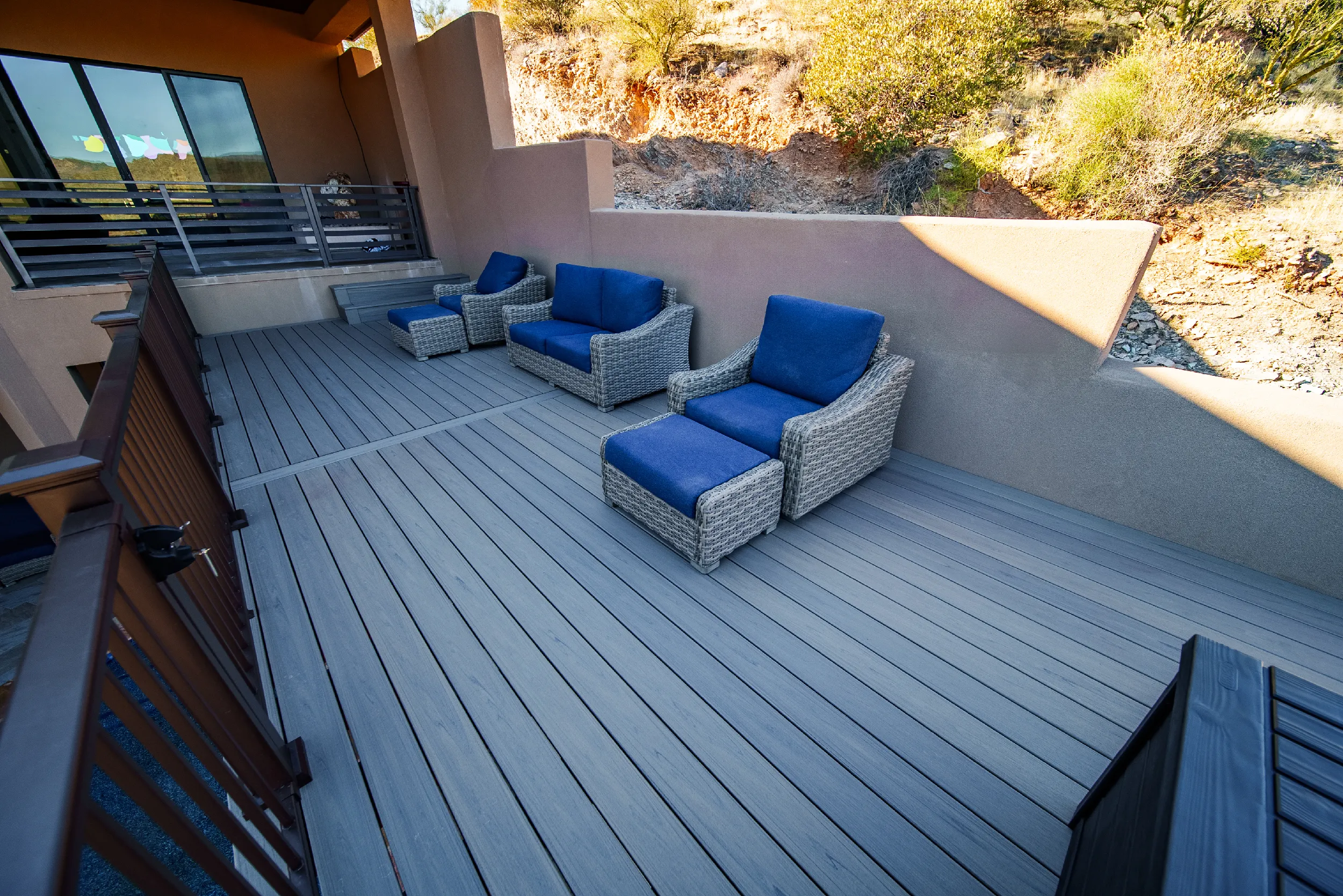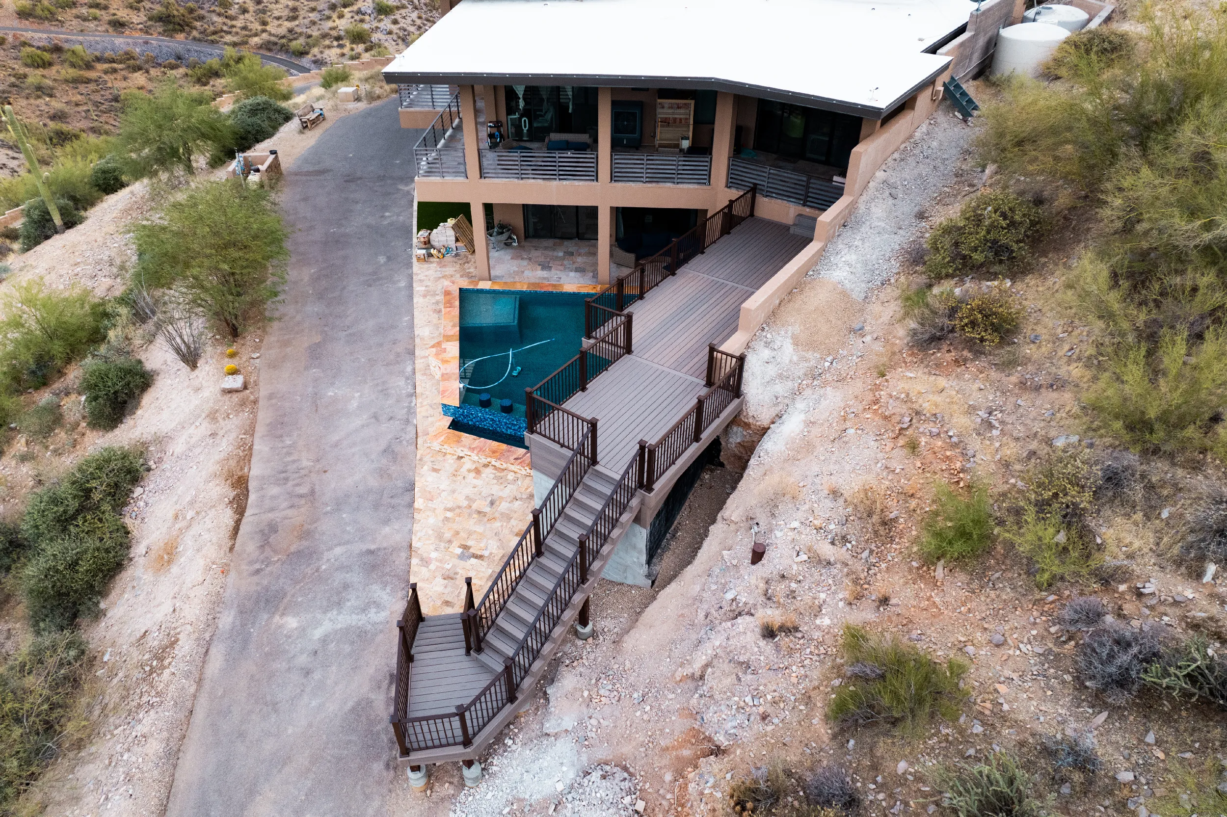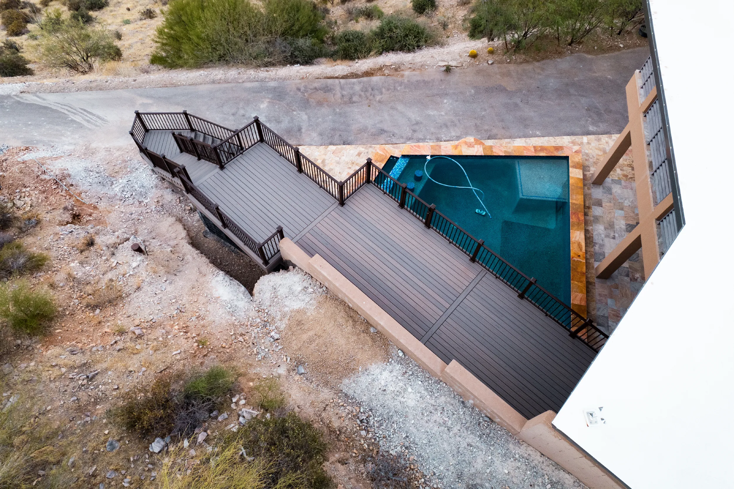 Located high atop a Cave Creek mountain, Christy and Joe wanted a deck that would not only provide 360 views of the surrounding natural beauty, but also provide below deck storage for all their outdoor needs and serve as a poolside deck overlooking their newly built, waterfall pool.