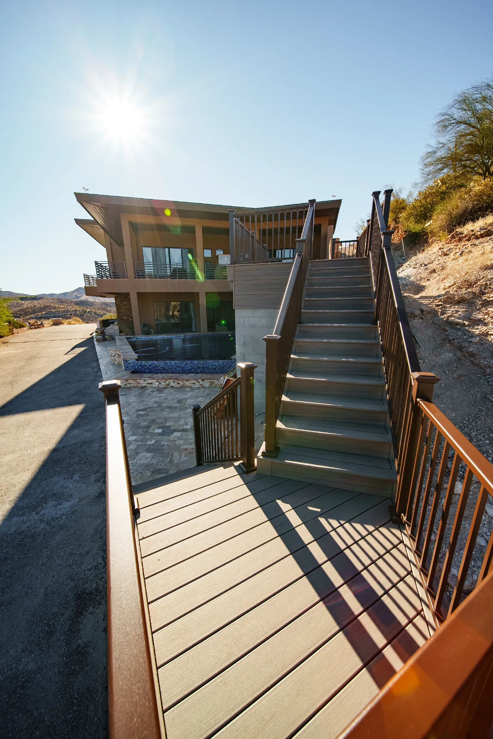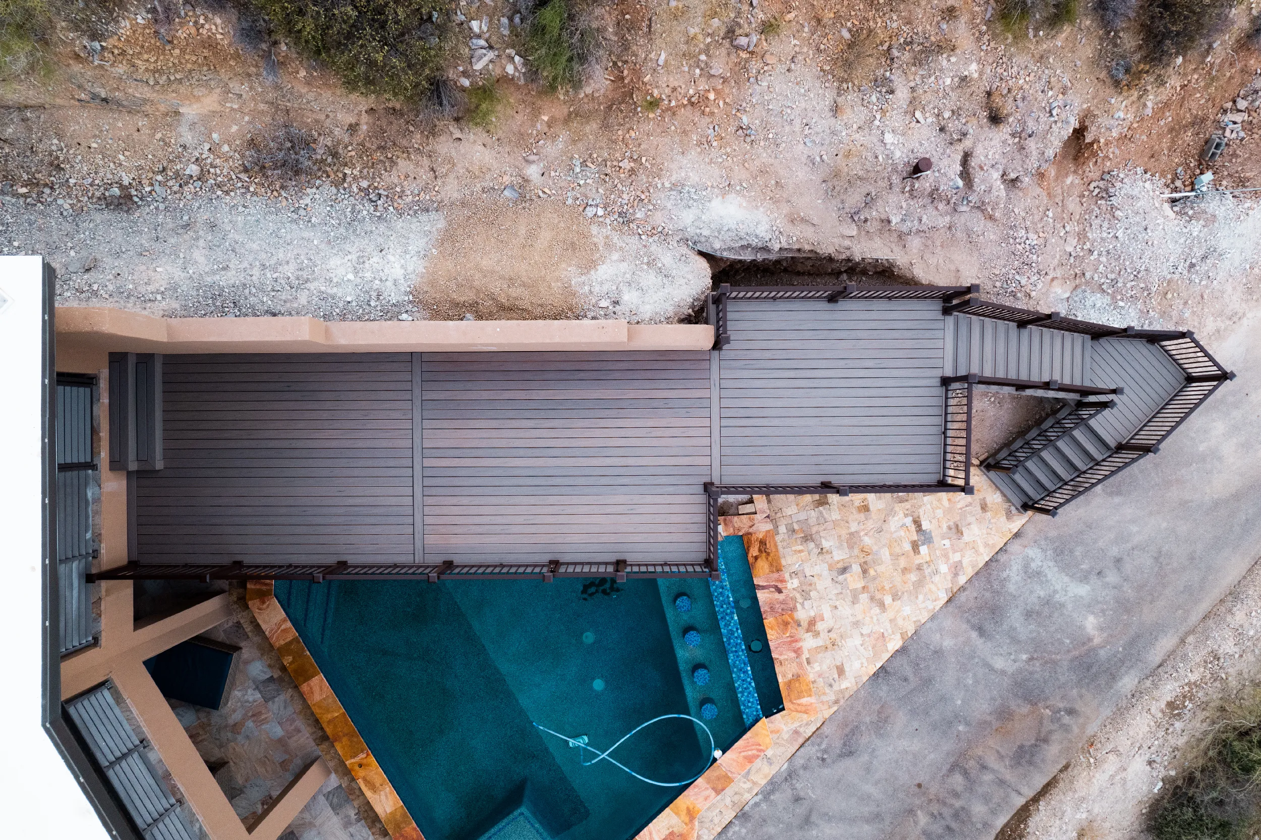 In spite of the material challenges given the elevation and the rocky terrain, HBC decks designed and constructed an elegant and carefully positioned second story deck that provided access from the second story of the home down to their poolside retreat. Using the Trex Transcend Lineage line of decking with cool decking technology and the Biscayne color, with its natural earth-tone variations, the colors of the deck blend in as one with the surrounding visages from 360 degrees.