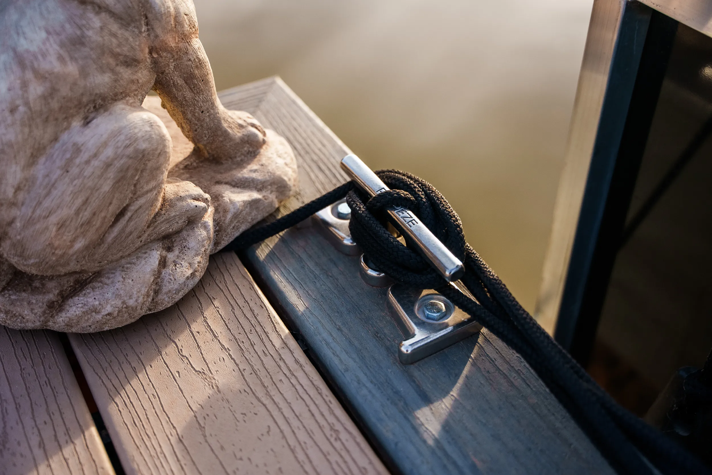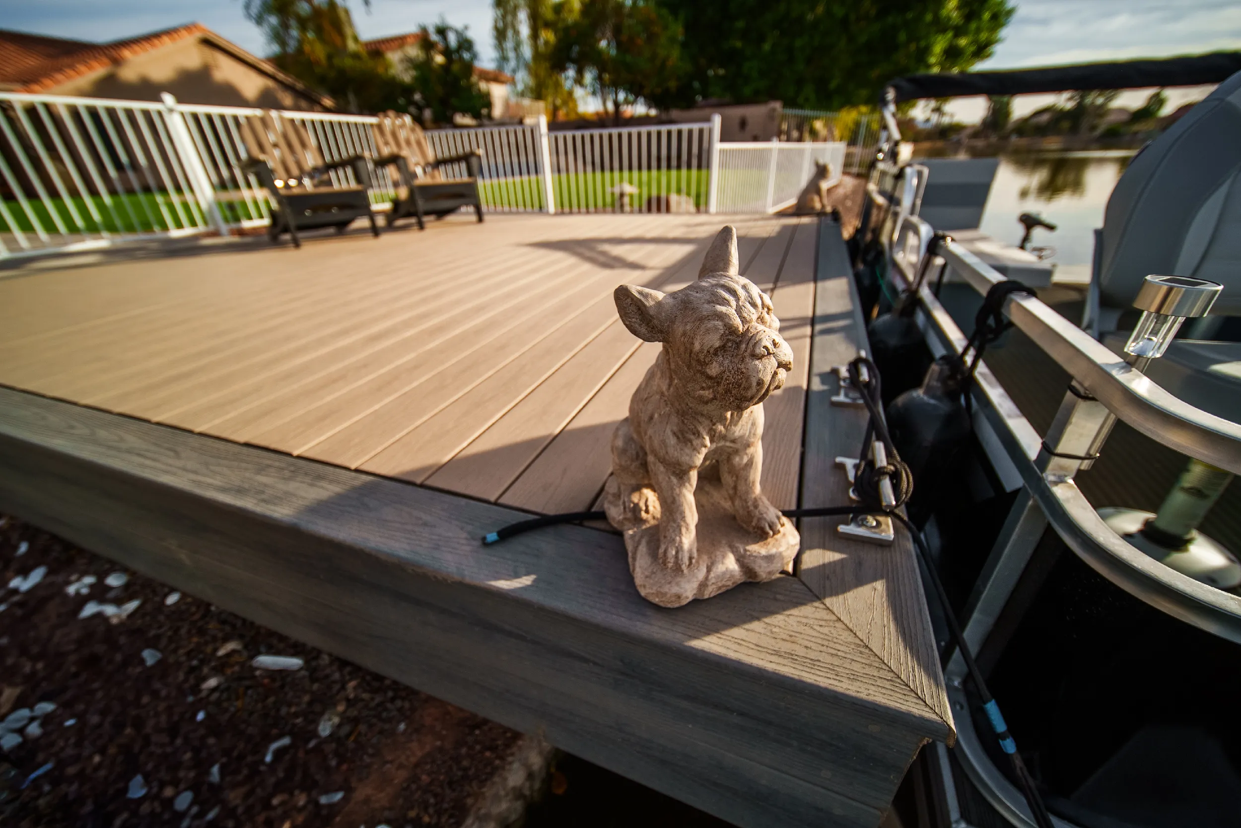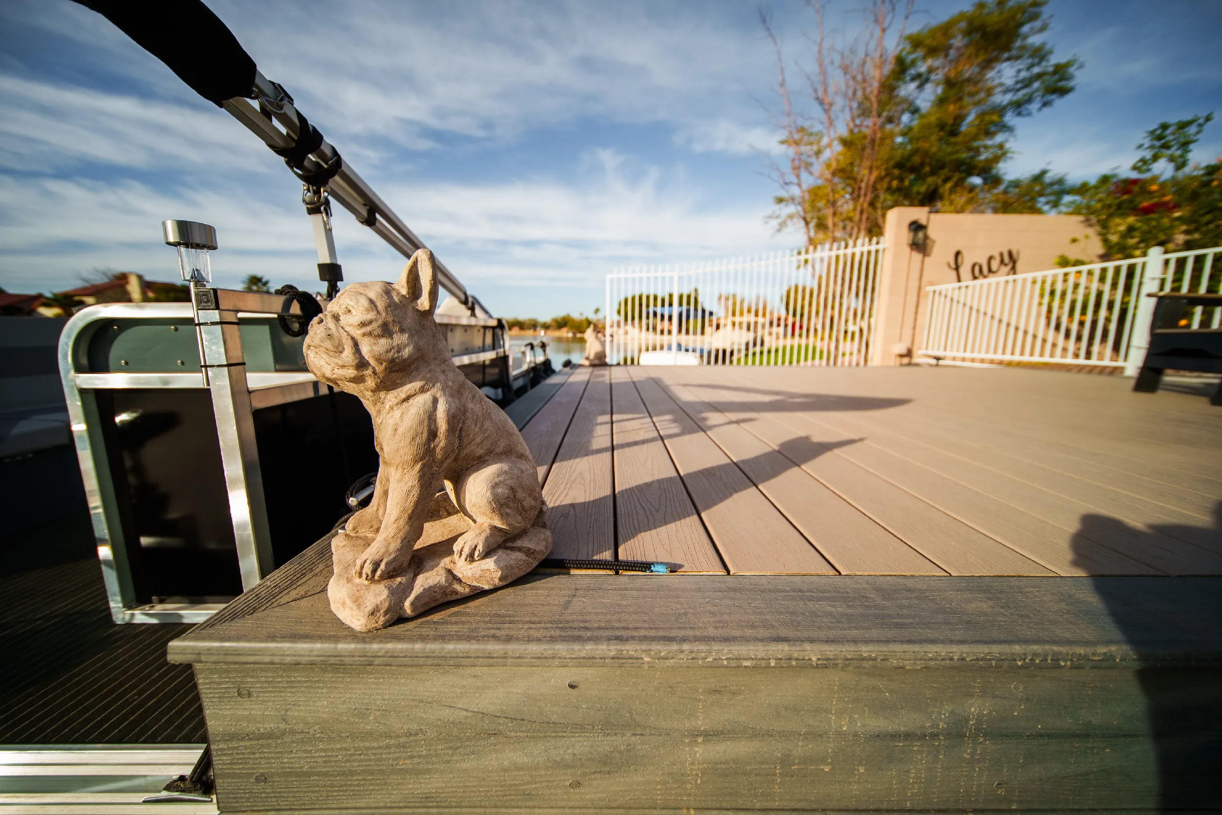 HBC Decks created an elegant, yet simple composite dock that blends seamlessly with the natural surroundings. After installing boat cleats for Susan and Mark, the dock was ready for them to place their lovely Adirondack chairs on the dock and their beautiful French Bull Dog statutes to man the corners. Every morning now they enjoy the sunrise during morning coffee, evening sunsets, and their new electric boat they named Lacy.