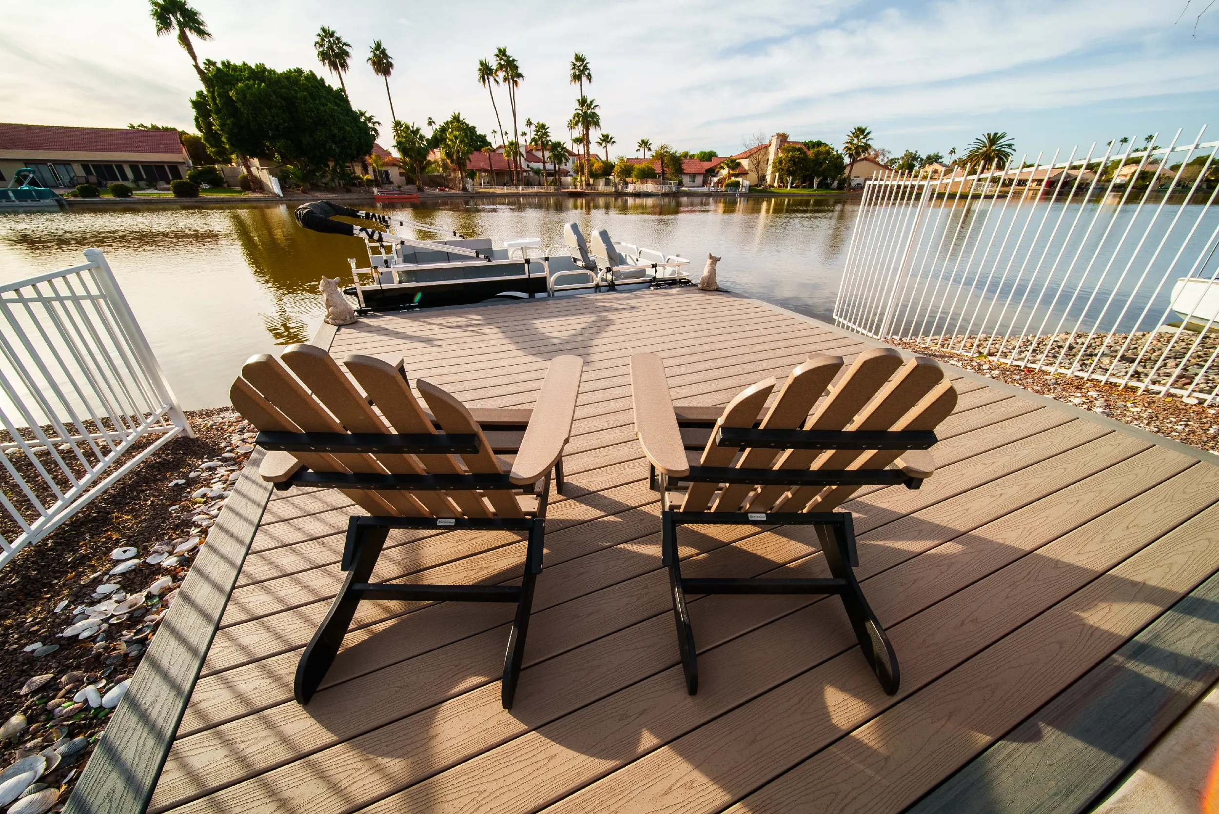 HBC Decks created a contemporary dock featuring rich composite tones and Adirondack chairs, ideal for enjoying panoramic water views in style.