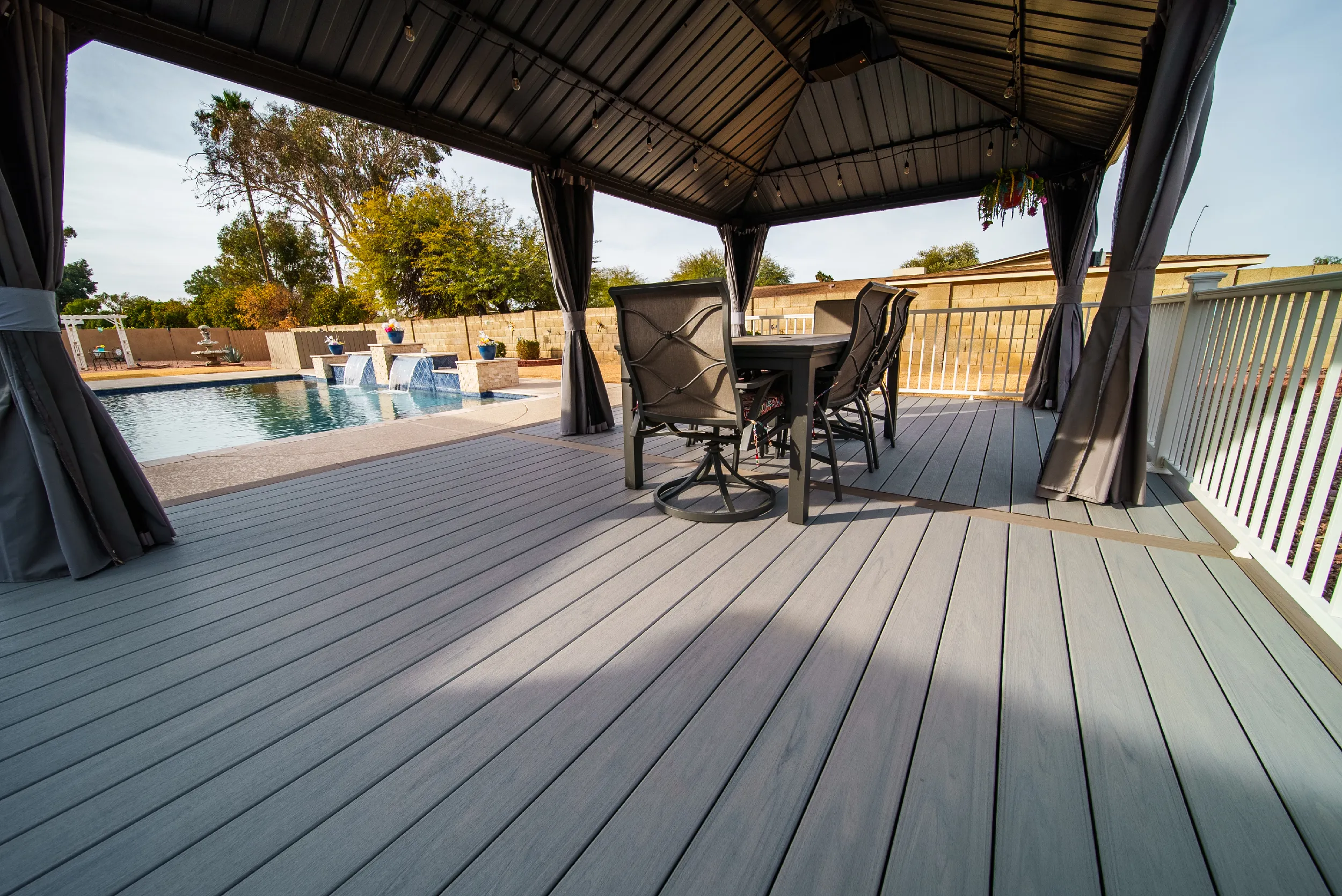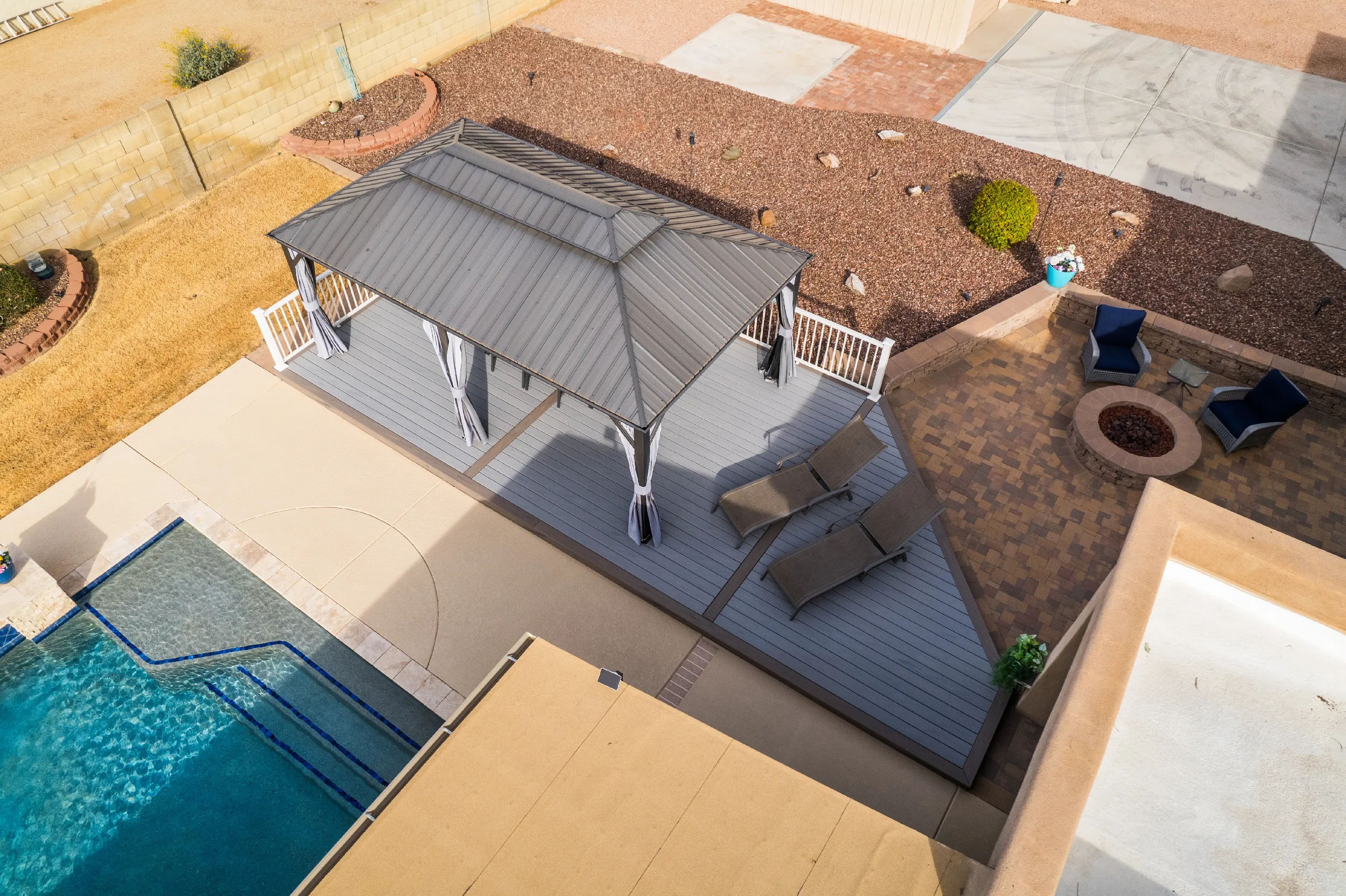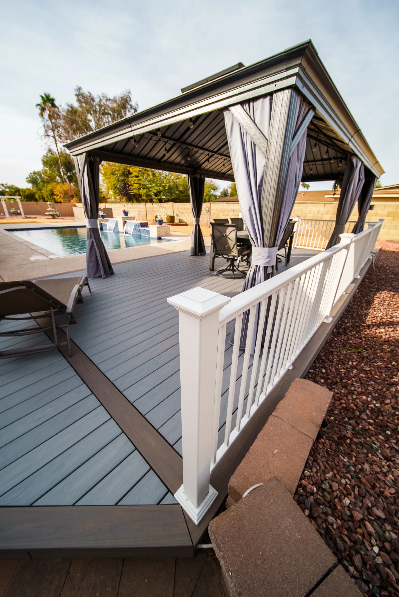 Together with Rick’s creative and engineering skills, HBC Decks designed a substructure sufficient to meet the load requirements for the gazebo, while providing a geometric appeal of a custom-shaped deck that perfectly fit their backyard. The combination of Trex Transcend Lineage Biscayne and Rainier colors matched the earthtones of the surrounding rocks behind but also blended in well with the pristine blue waters of the saline pool.