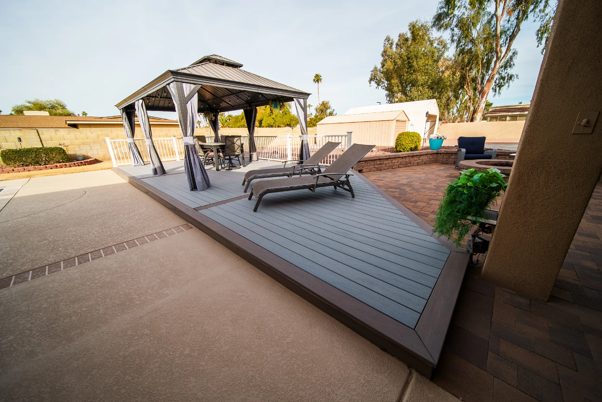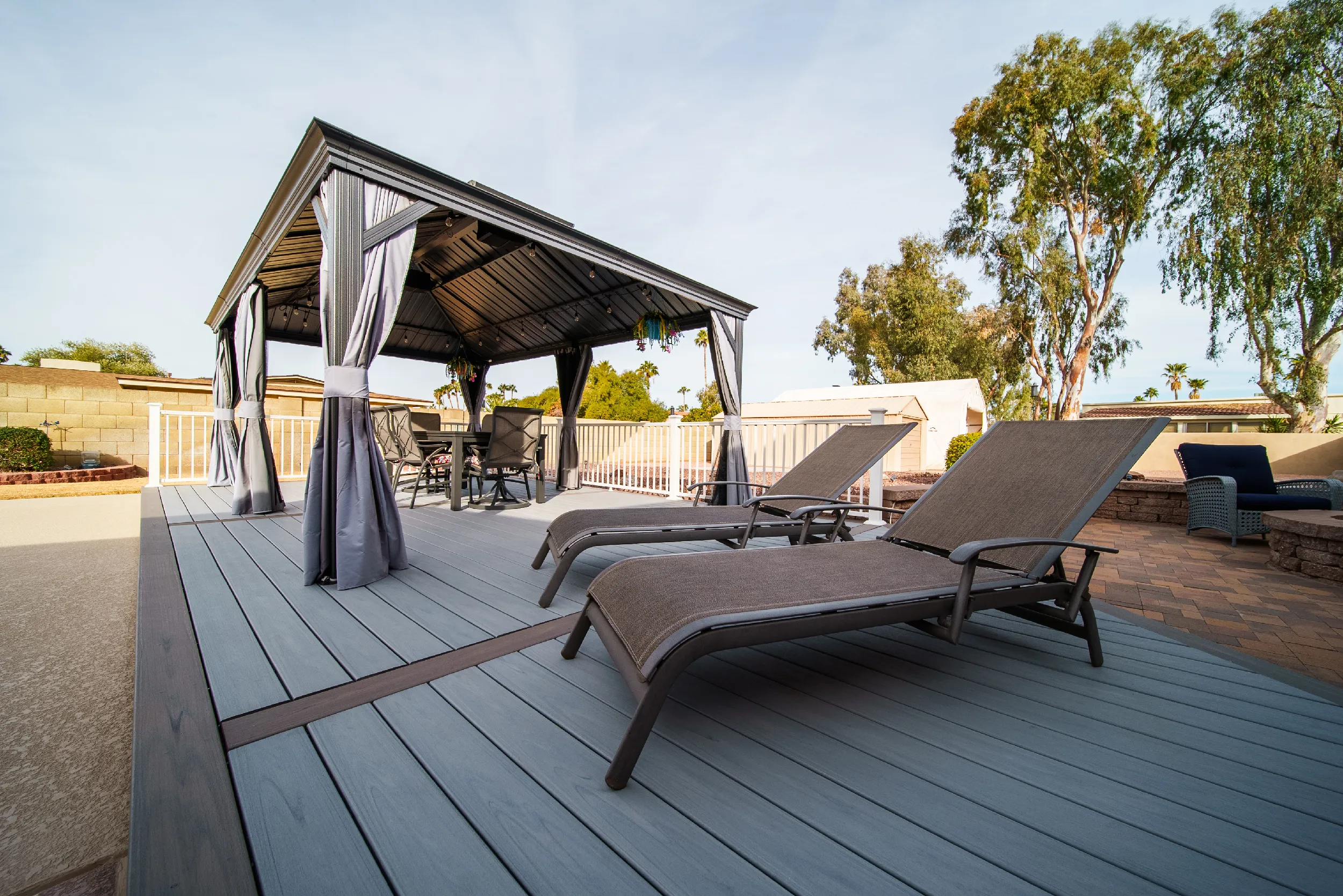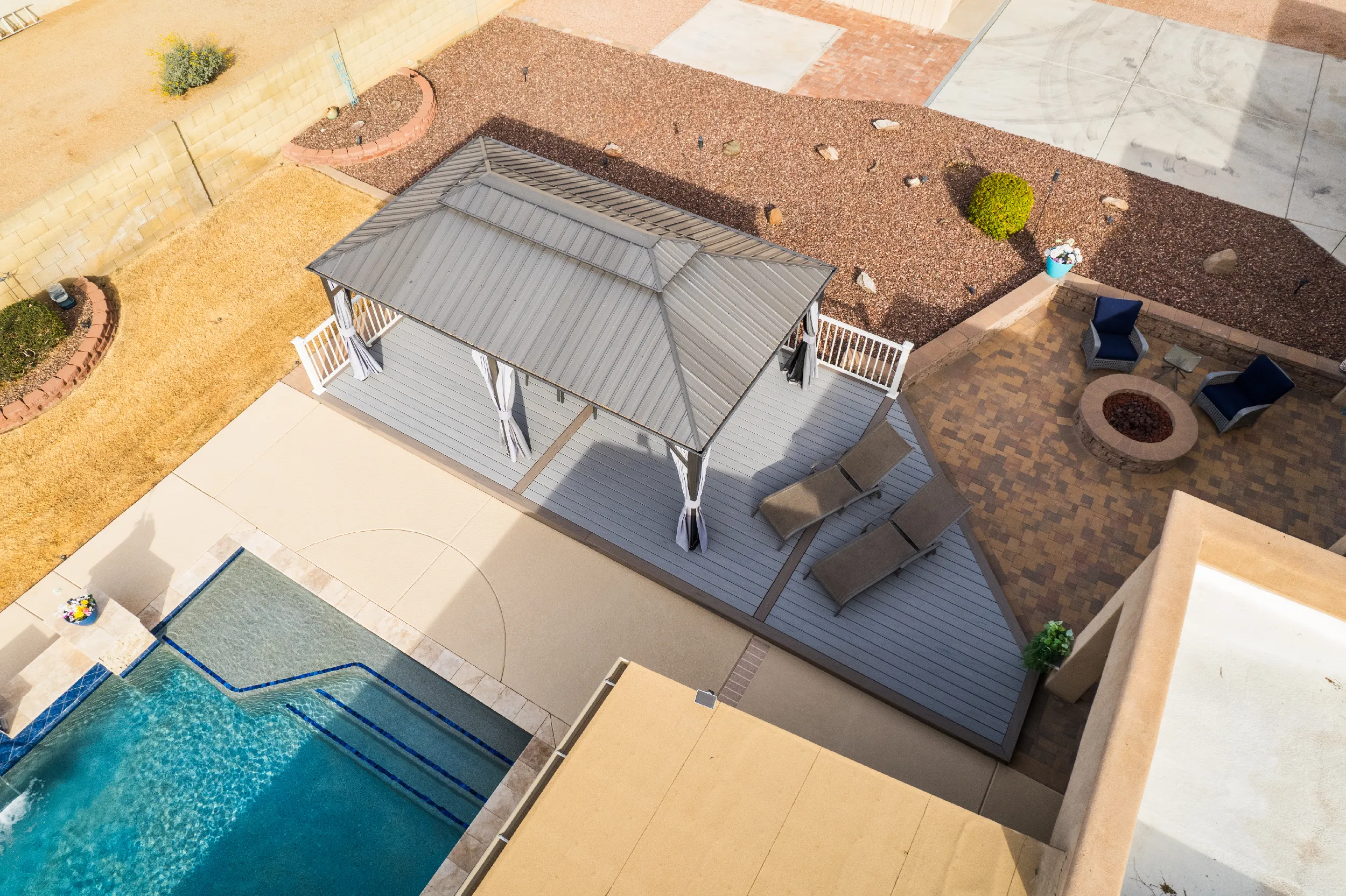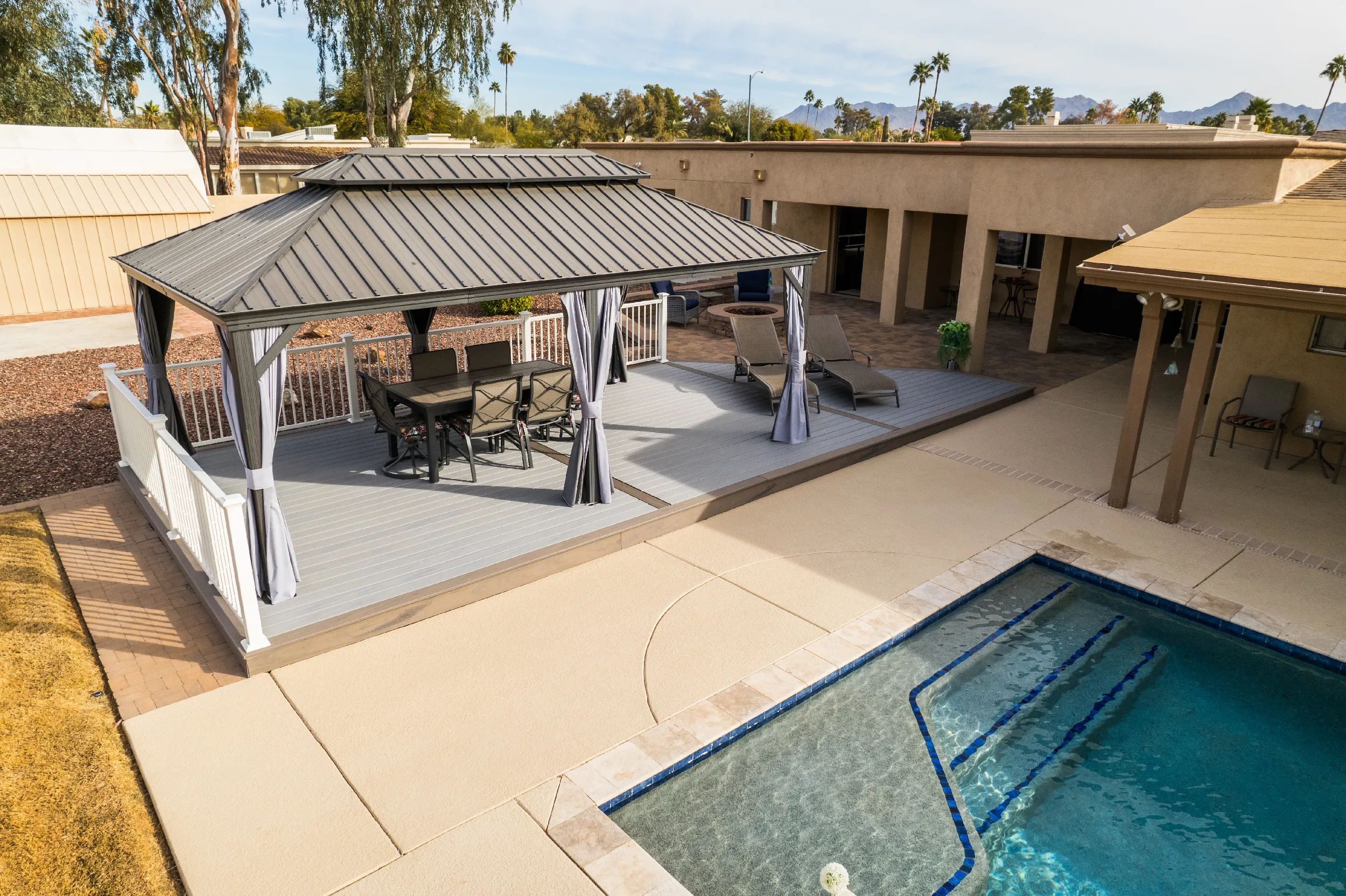 Together with Rick’s creative and engineering skills, HBC Decks designed a substructure sufficient to meet the load requirements for the gazebo, while providing a geometric appeal of a custom-shaped deck that perfectly fit their backyard. The combination of Trex Transcend Lineage Biscayne and Rainier colors matched the earthtones of the surrounding rocks behind but also blended in well with the pristine blue waters of the saline pool.