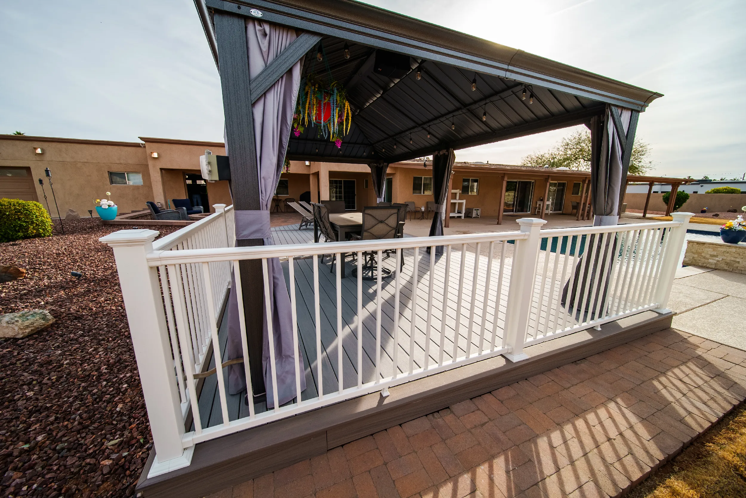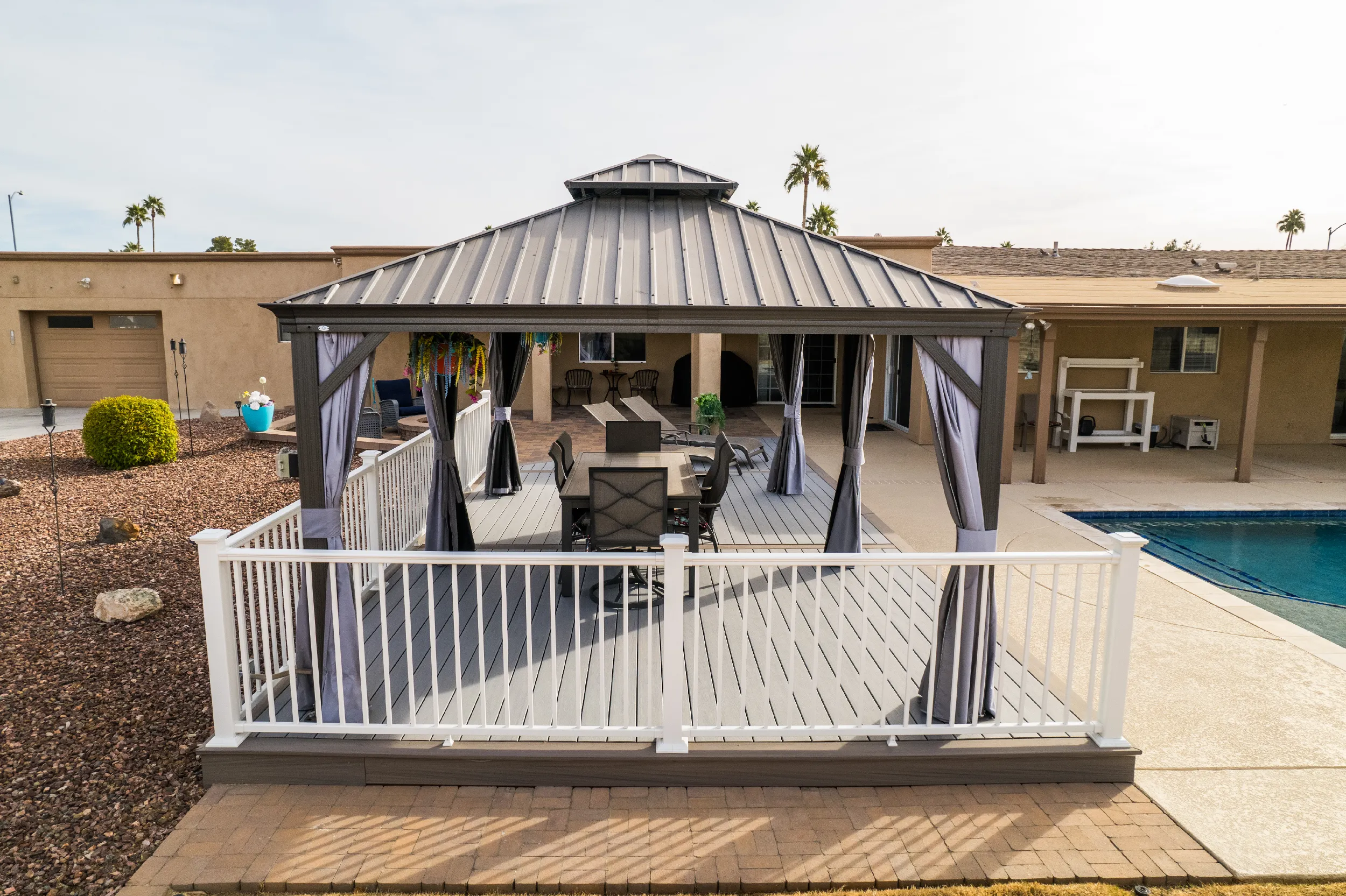 The final Poolside Pavilion that Rick and Liz and we created together is truly a masterpiece worthy of the beautiful backyard oasis they were going for. And while the white railing on the deck was not required, it provided the perfect delineation between the softscapes behind the deck and the poolside in front of the deck. With their backyard finally complete with their new Trex deck and Gozyard Gazebo, Rick and Liz enjoy a pool side seat after a little swim almost on a daily basis (when they aren’t traversing the country in their side-by-side).