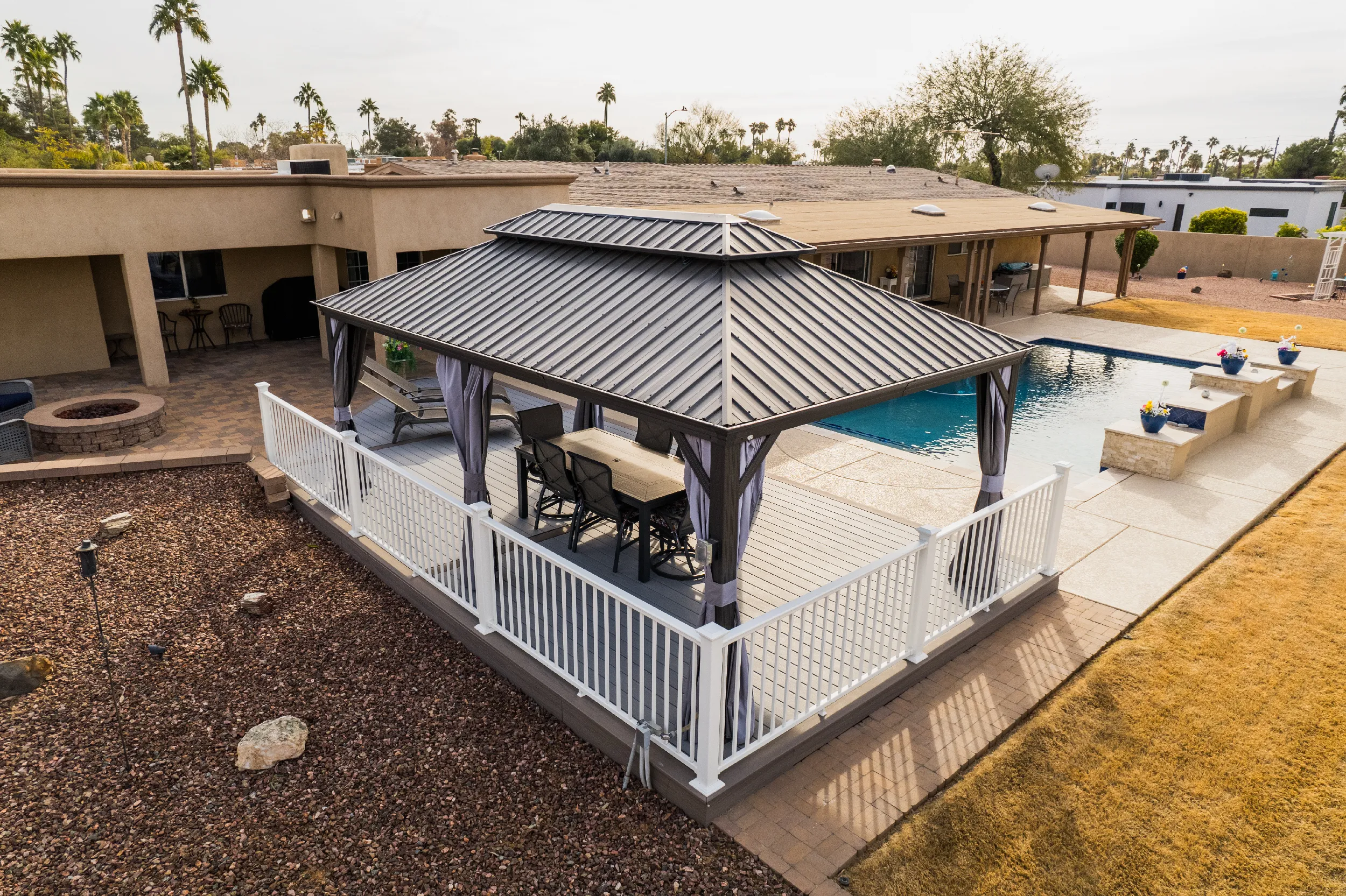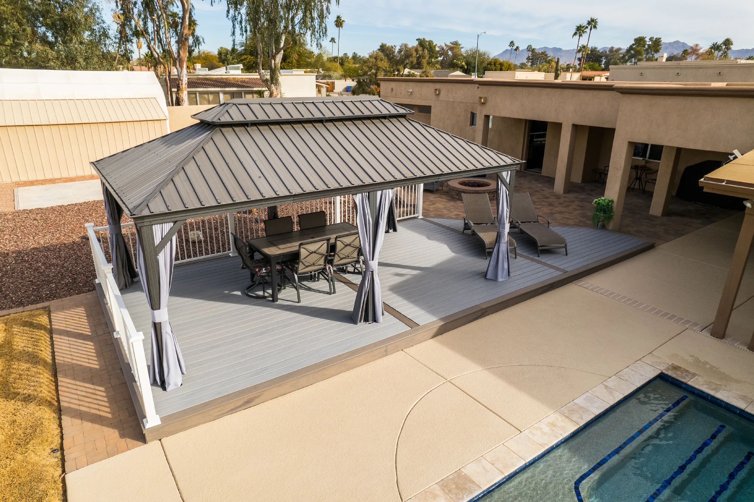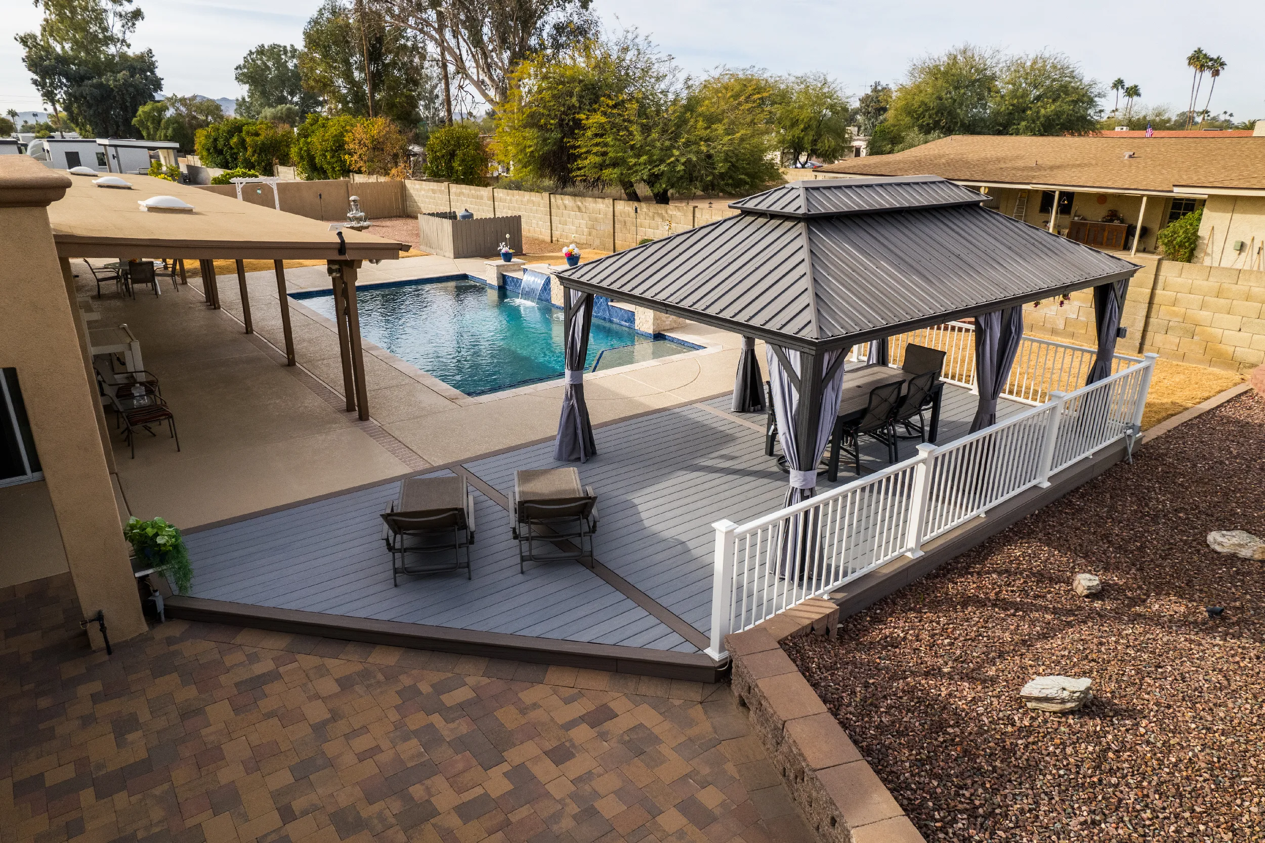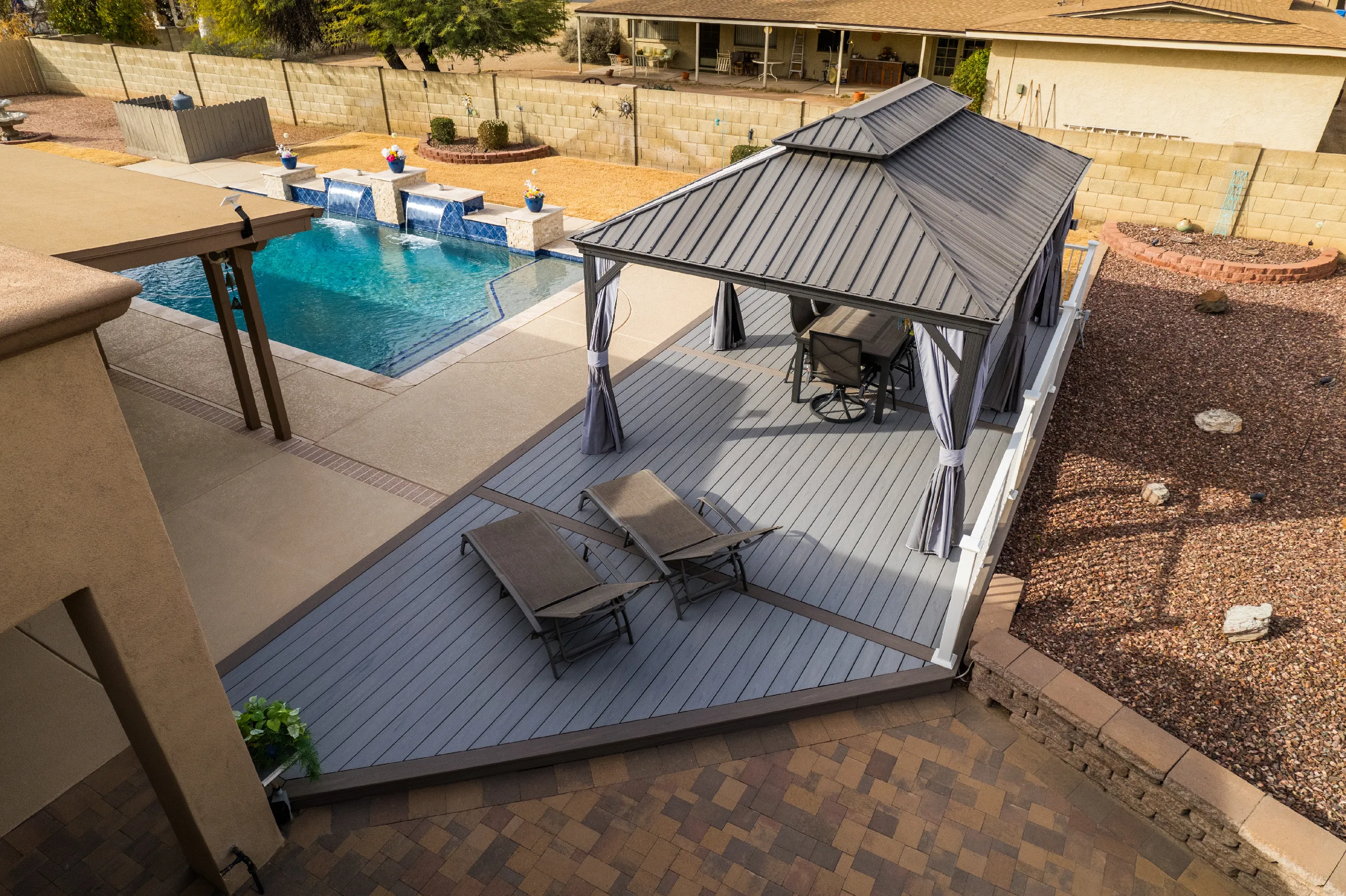 To match a waterfall pool, HBC Decks built a poolside pavilion, turning this North Scottsdale backyard into an oasis with Trex Lineage & Kozyard Gazebo.