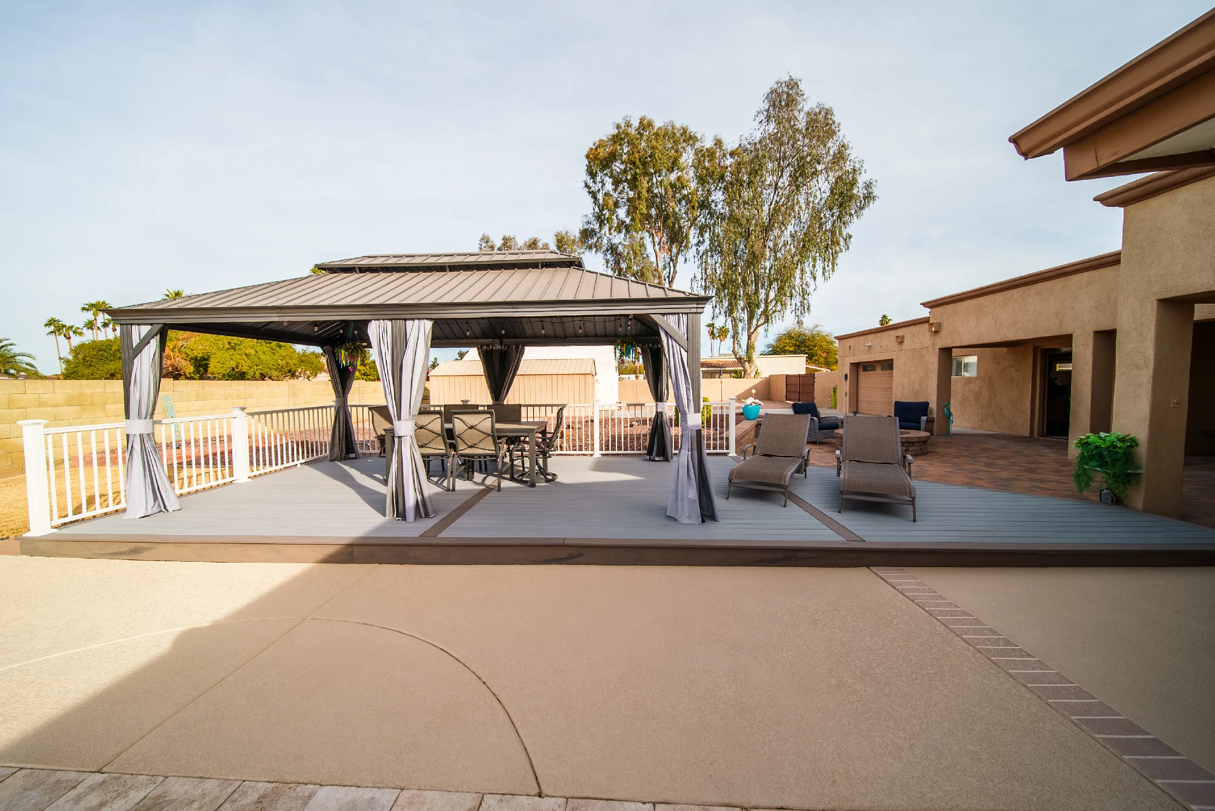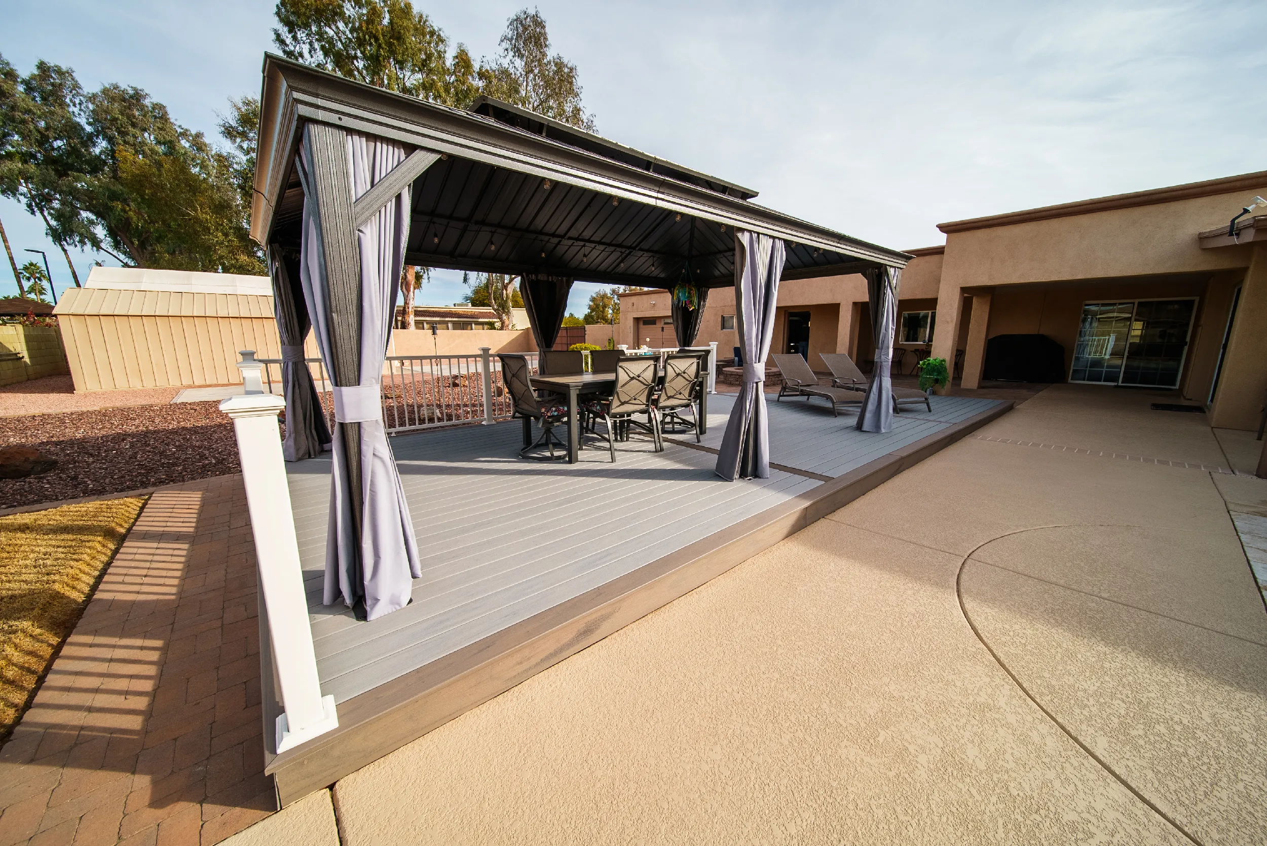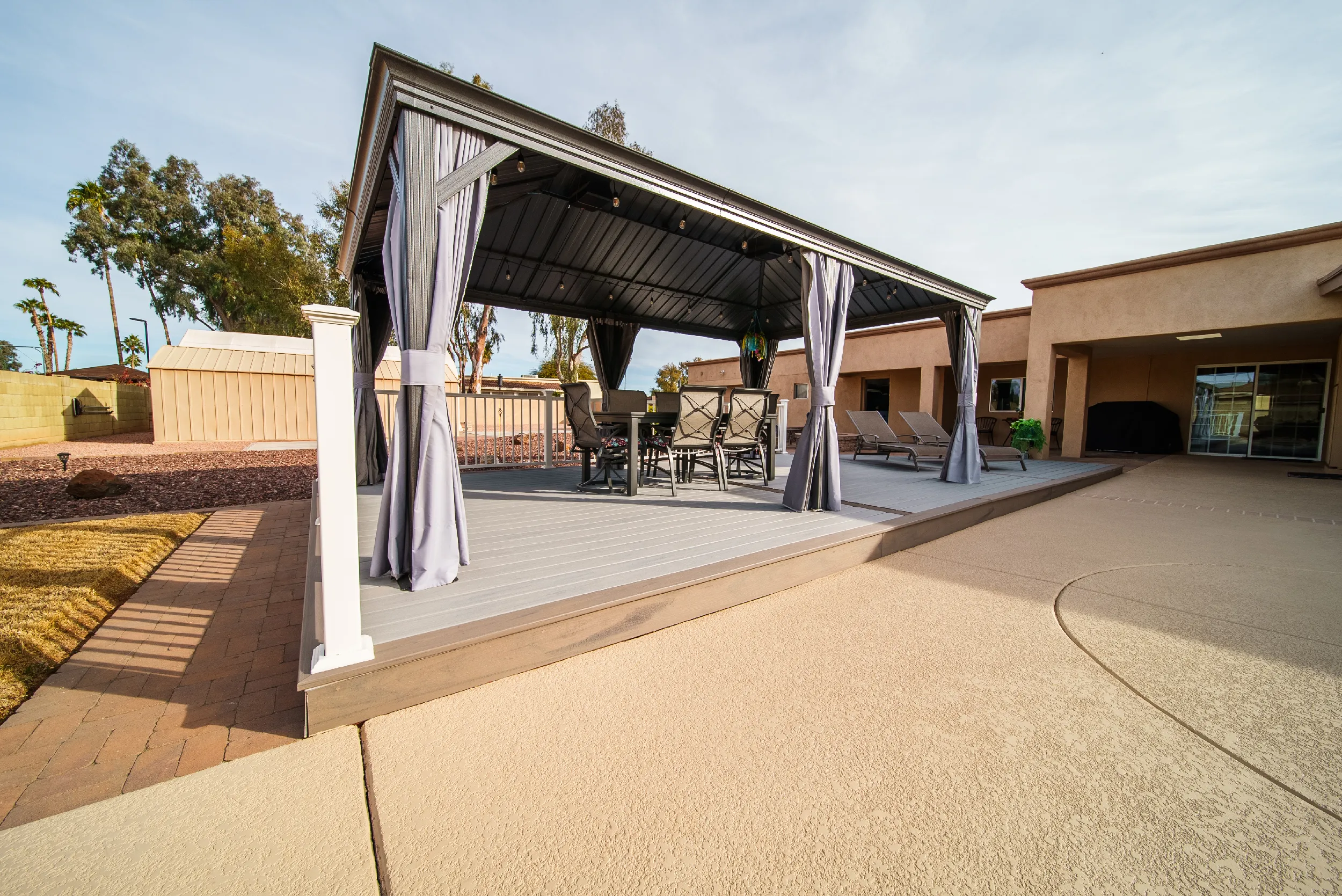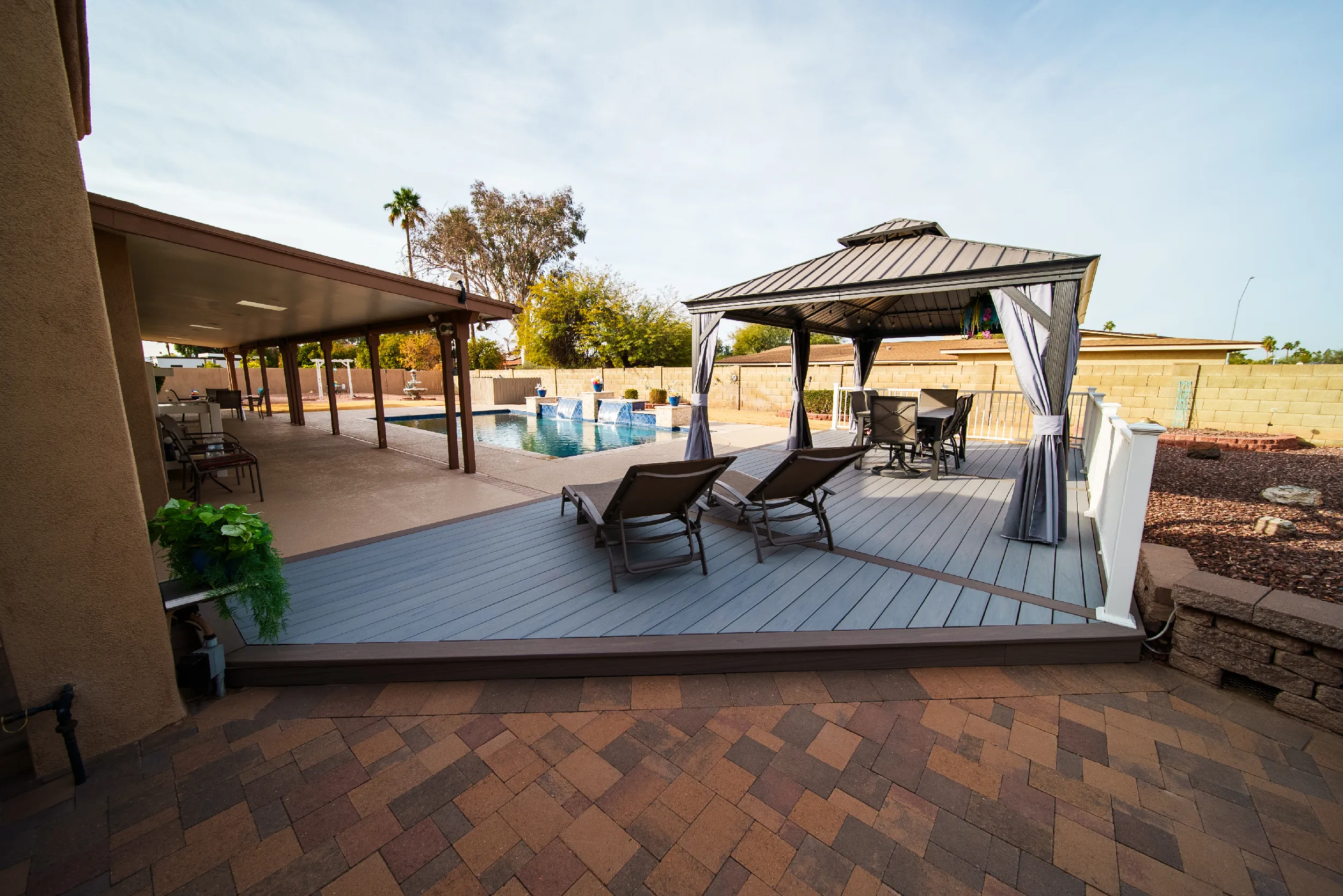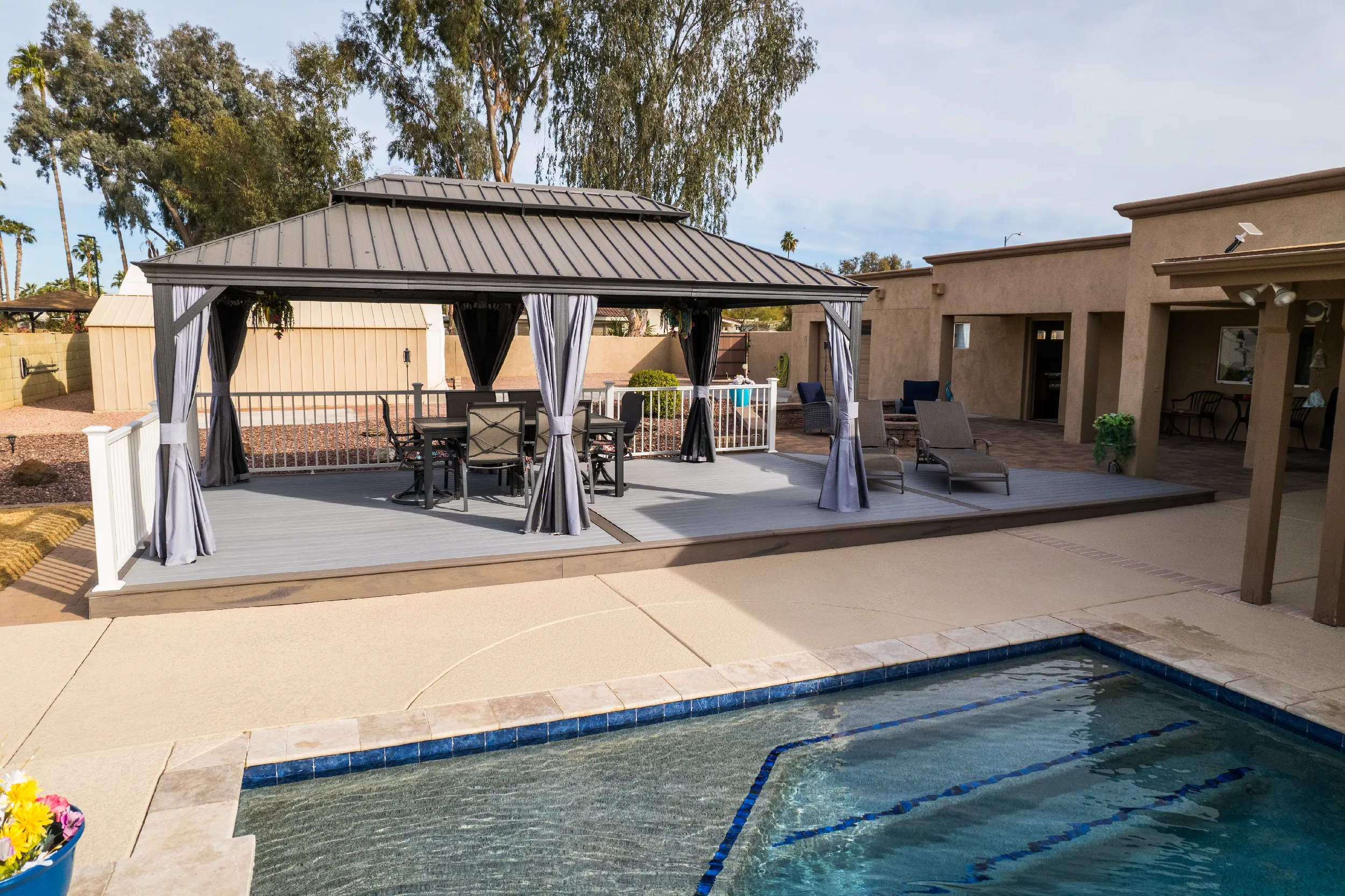To match a waterfall pool, HBC Decks built a poolside pavilion, turning this North Scottsdale backyard into an oasis with Trex Lineage & Kozyard Gazebo.