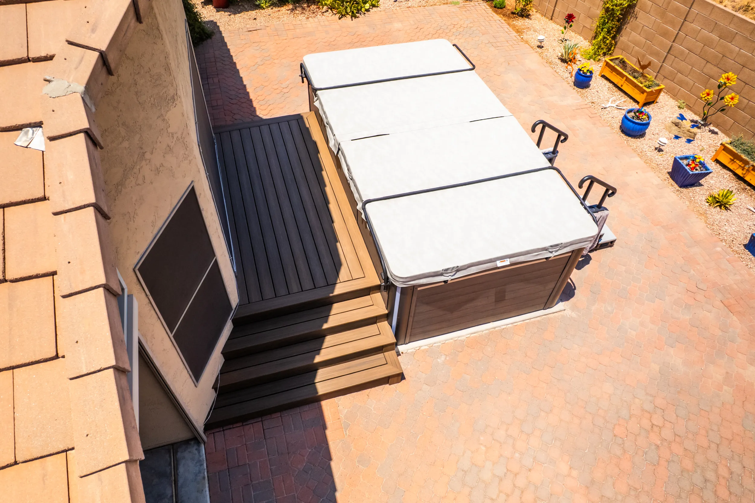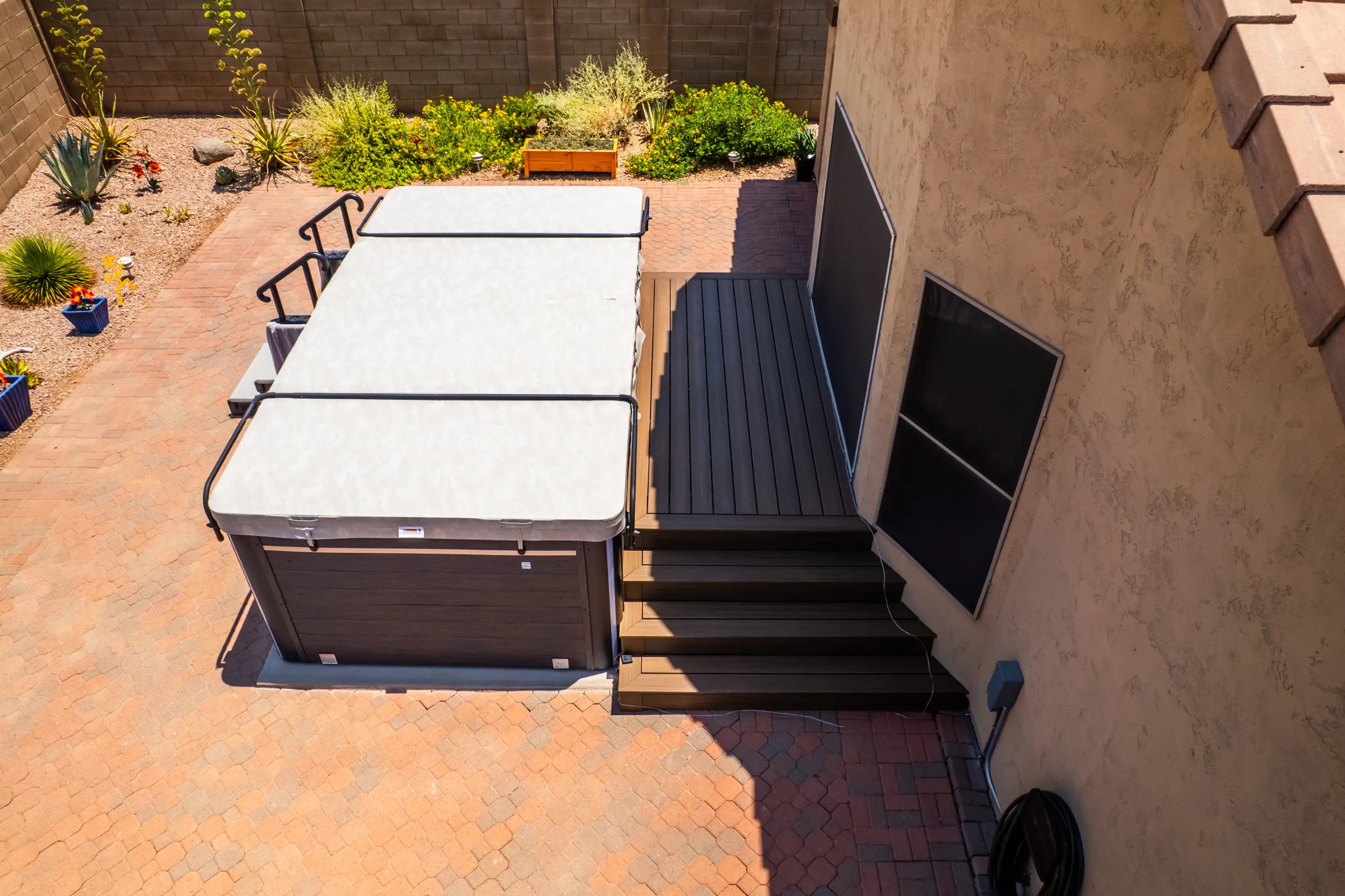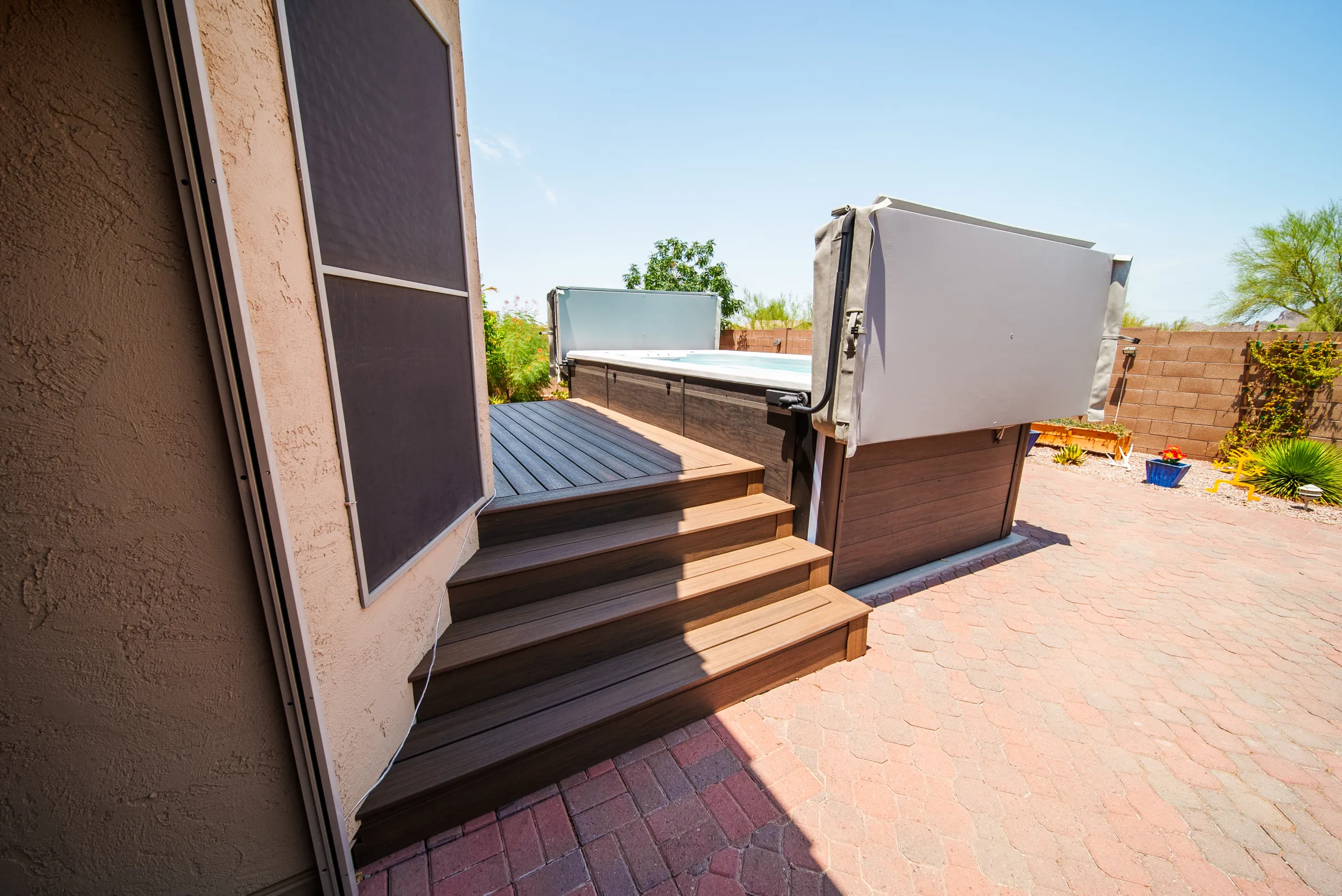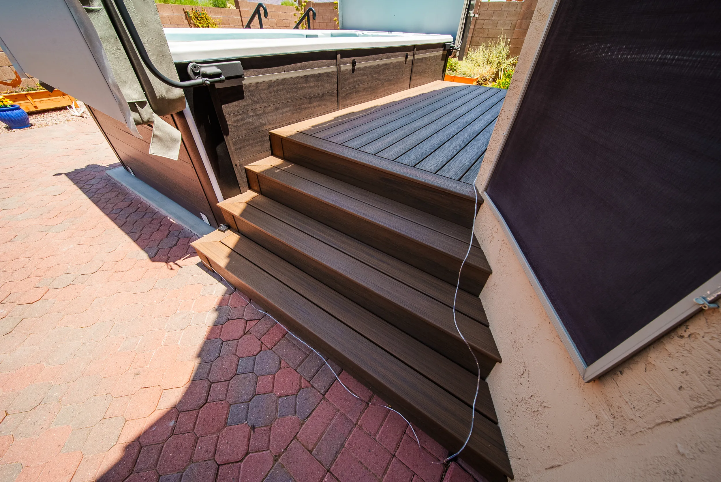 HBC Decks recommended Trex Enhance Naturals in Toasted Sand for its warm tones and durability against moisture and Arizona’s harsh sun. A compact yet functional deck was designed with steps leading directly up to the spa, ensuring a smooth transition from patio to water. The material choice and layout kept the build simple but elevated the overall look of the backyard.