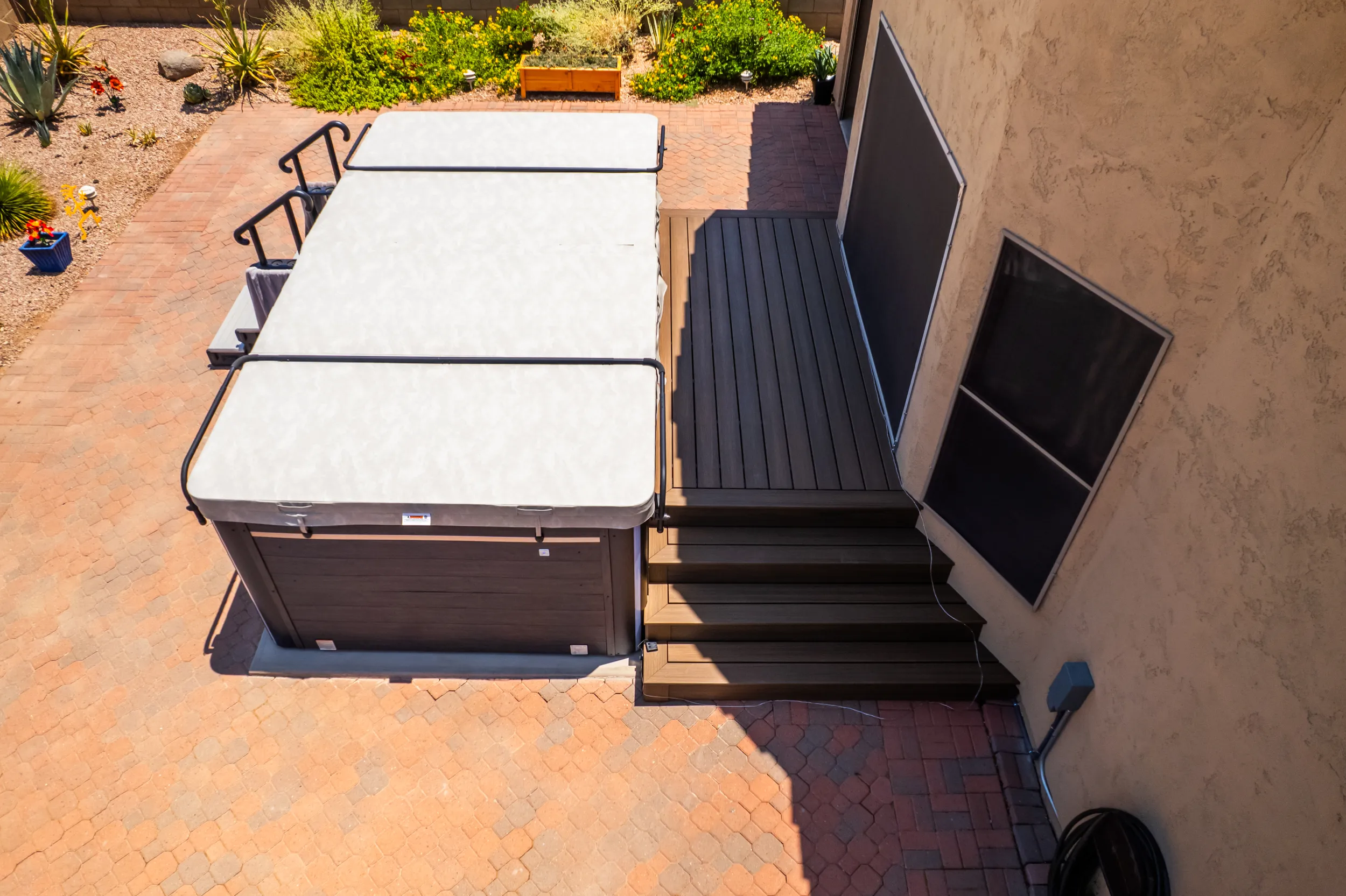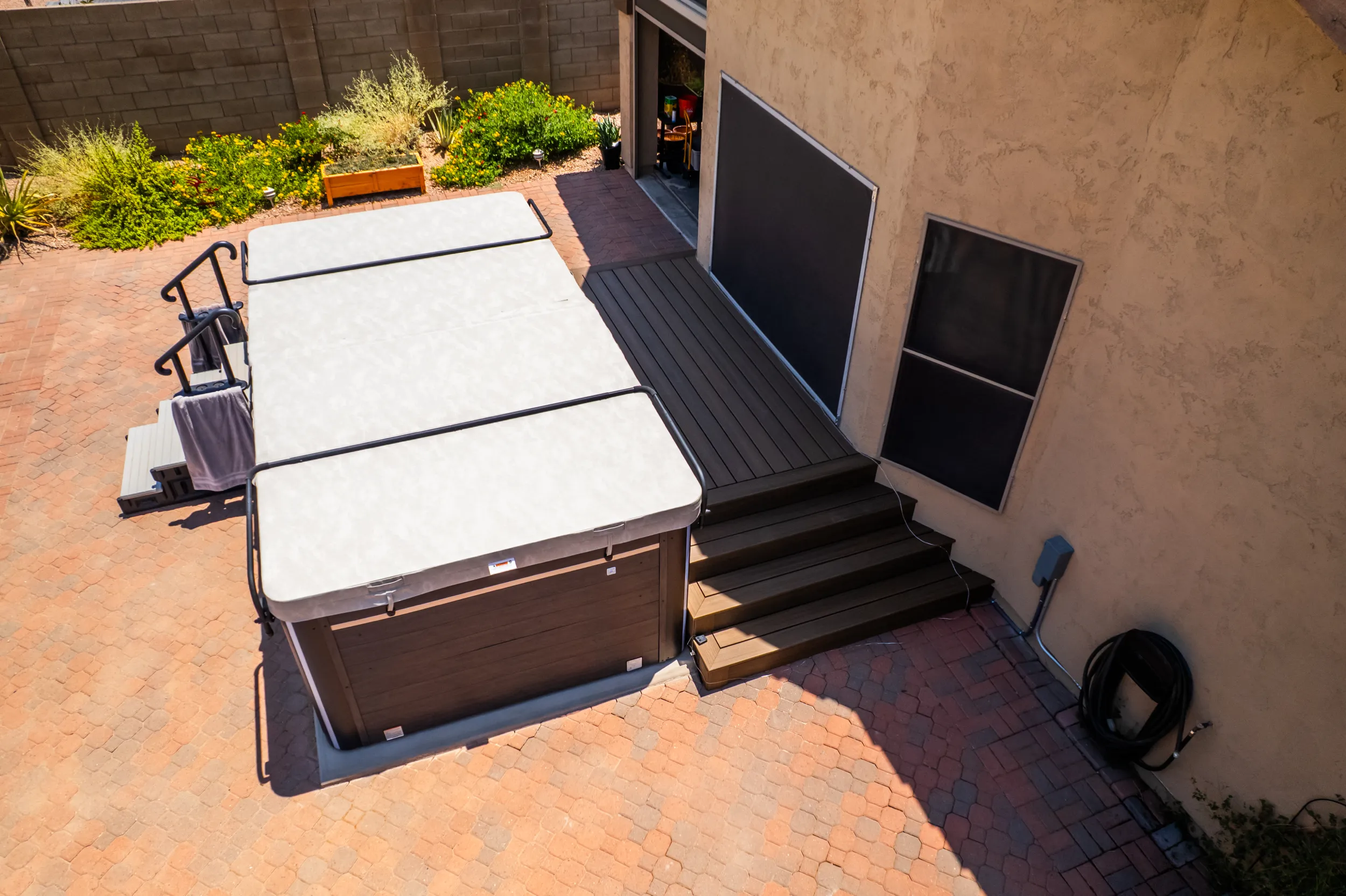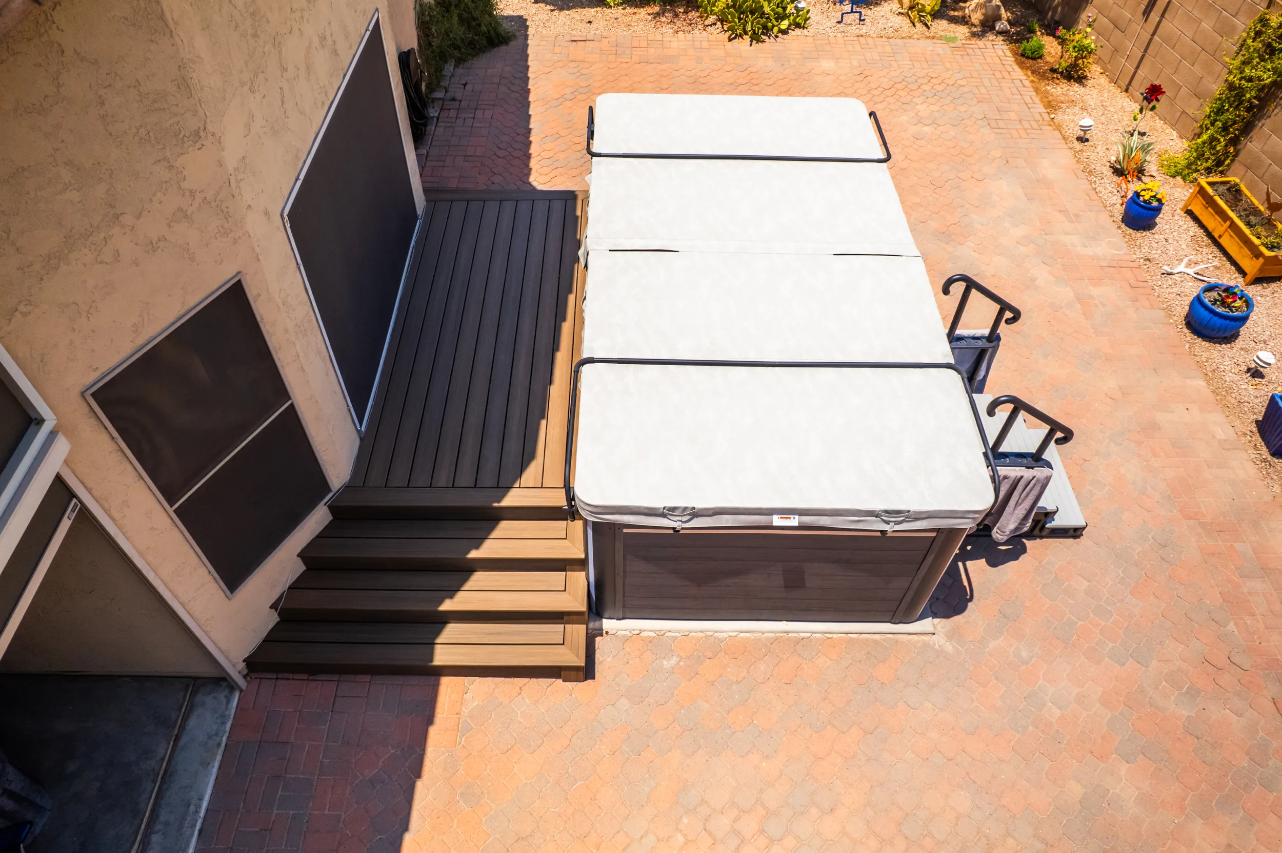 HBC Decks recommended Trex Enhance Naturals in Toasted Sand for its warm tones and durability against moisture and Arizona’s harsh sun. A compact yet functional deck was designed with steps leading directly up to the spa, ensuring a smooth transition from patio to water. The material choice and layout kept the build simple but elevated the overall look of the backyard.