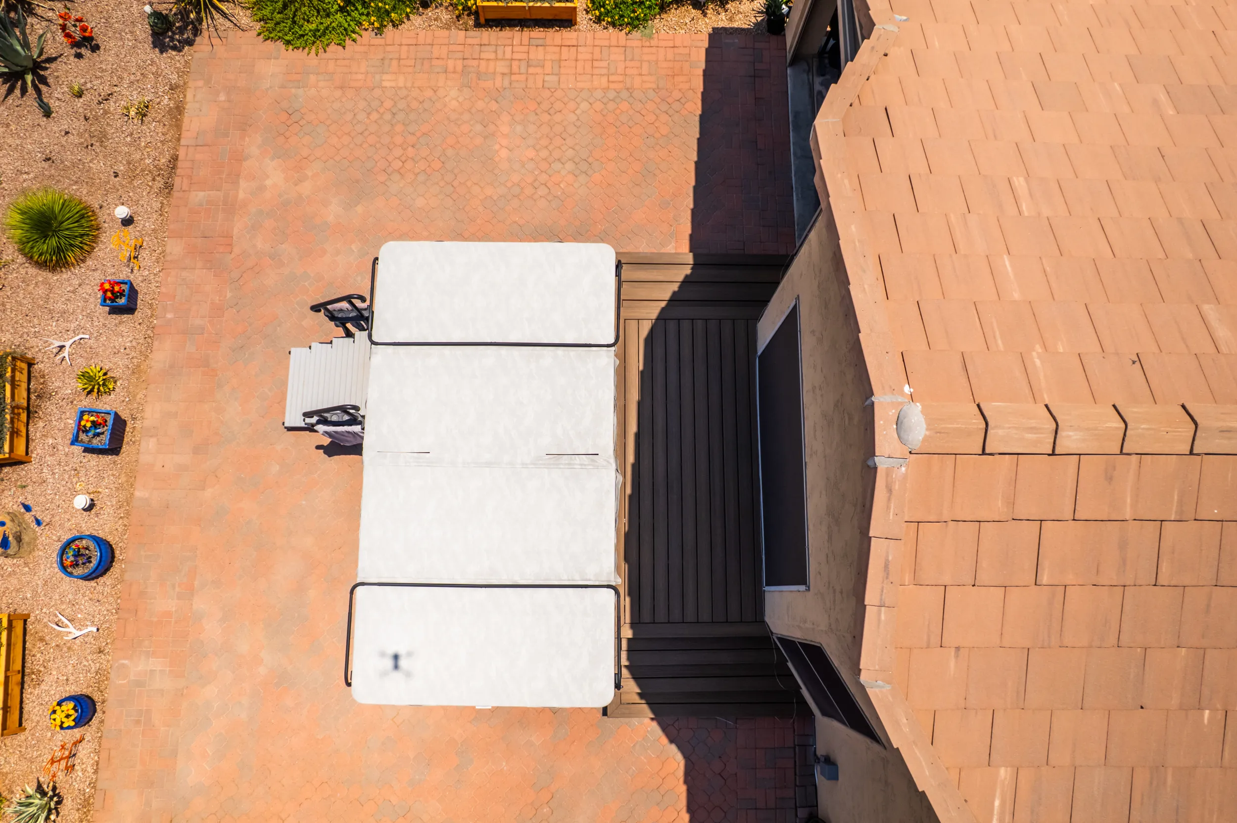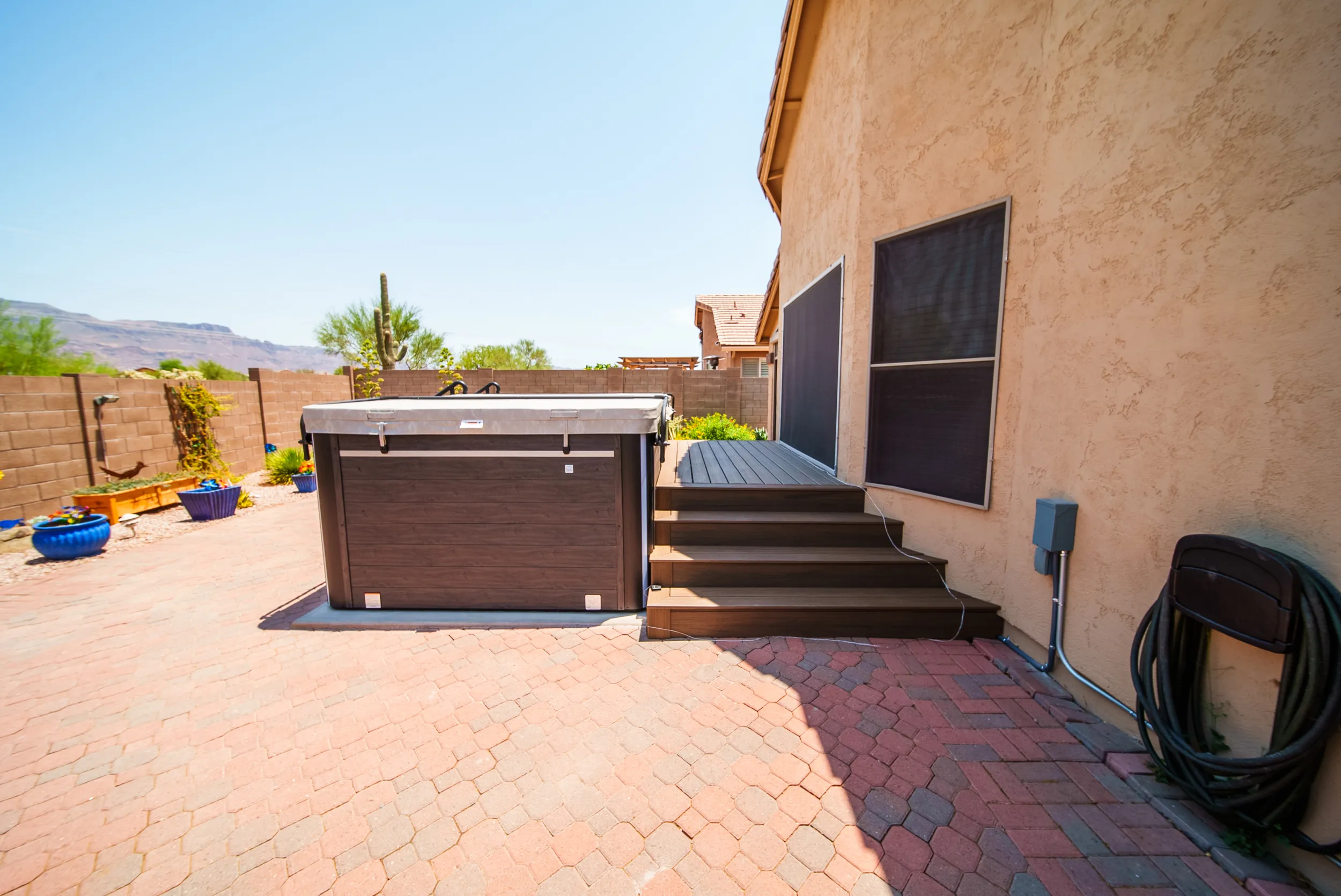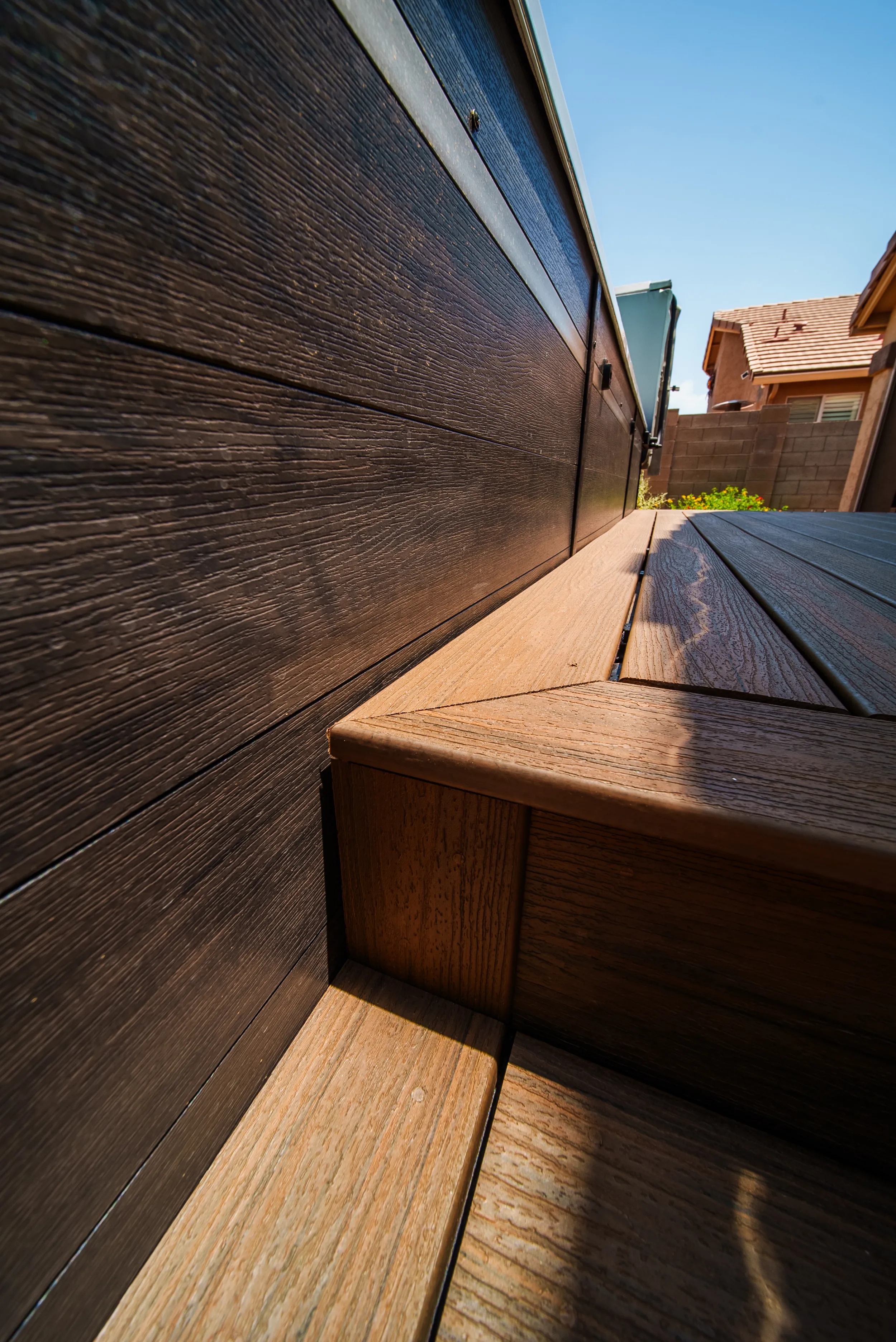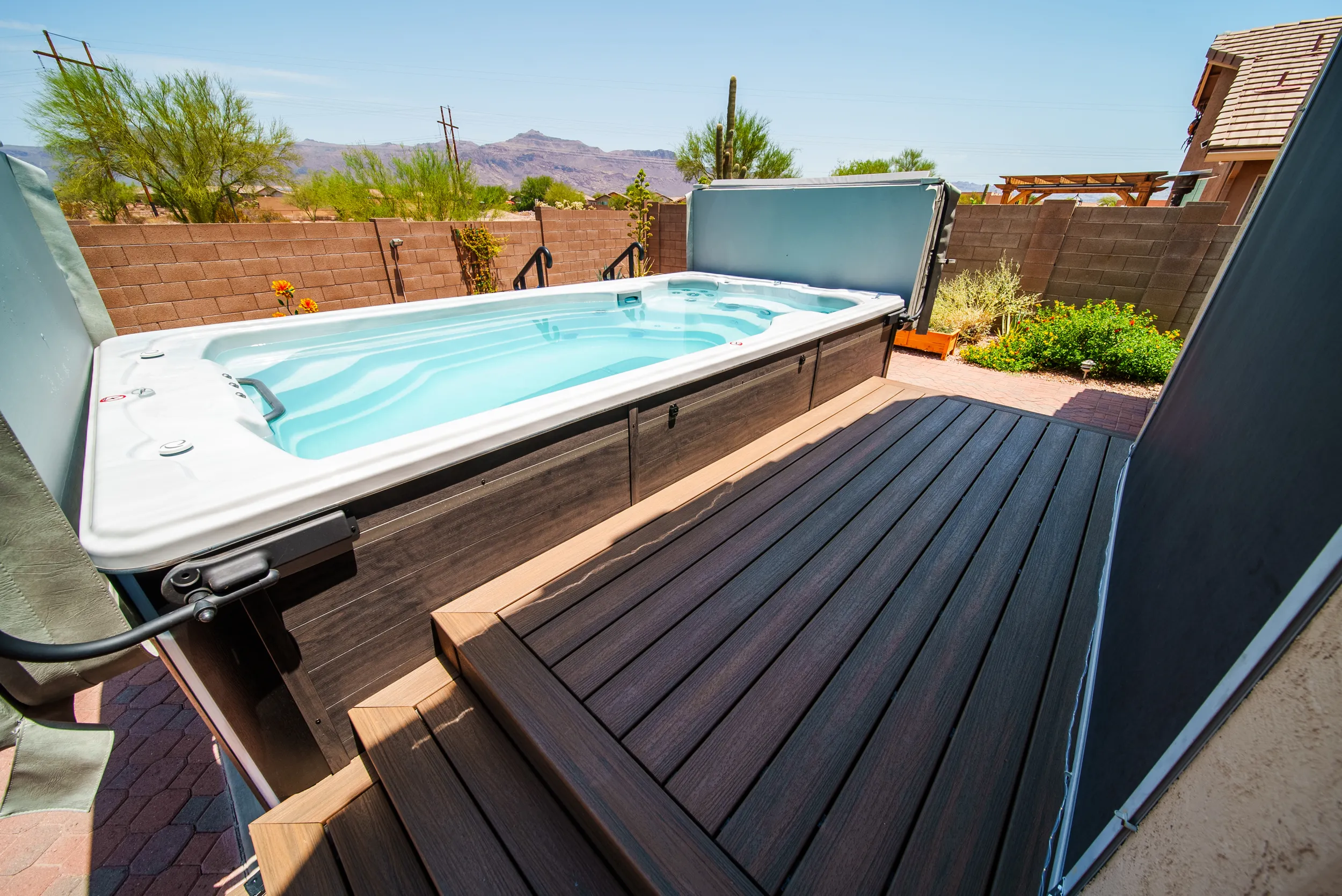 HBC Decks recommended Trex Enhance Naturals in Toasted Sand for its warm tones and durability against moisture and Arizona’s harsh sun. A compact yet functional deck was designed with steps leading directly up to the spa, ensuring a smooth transition from patio to water. The material choice and layout kept the build simple but elevated the overall look of the backyard.