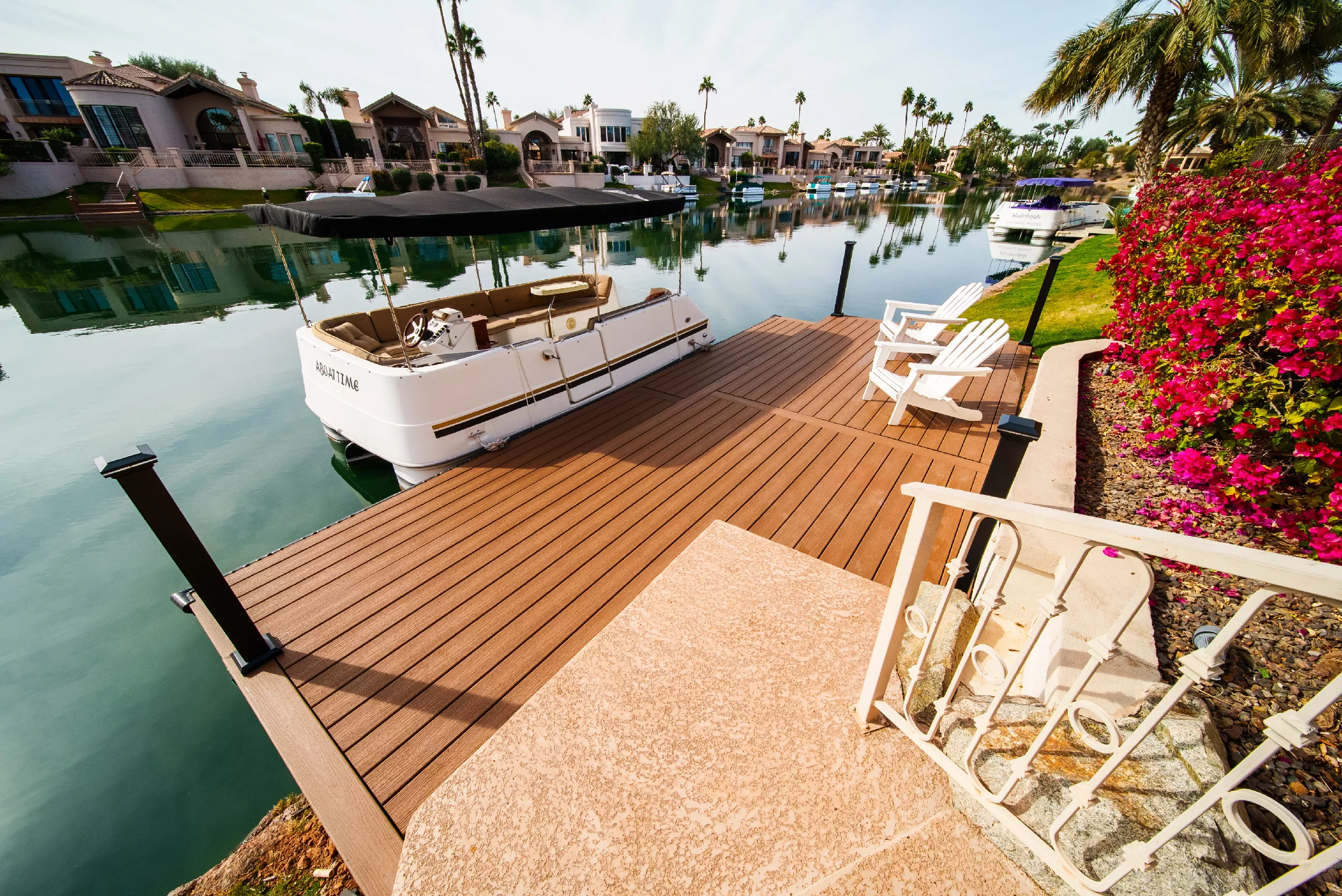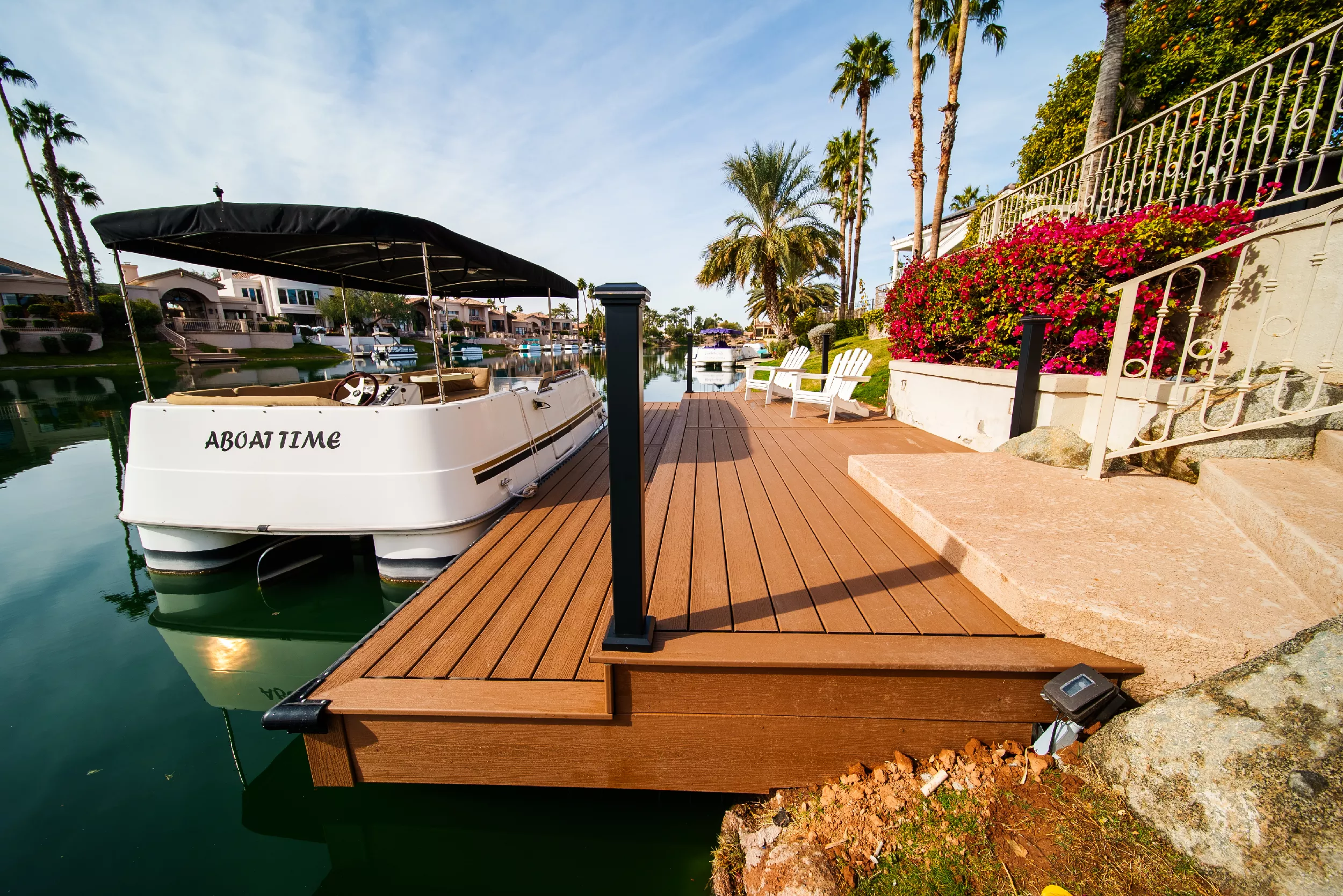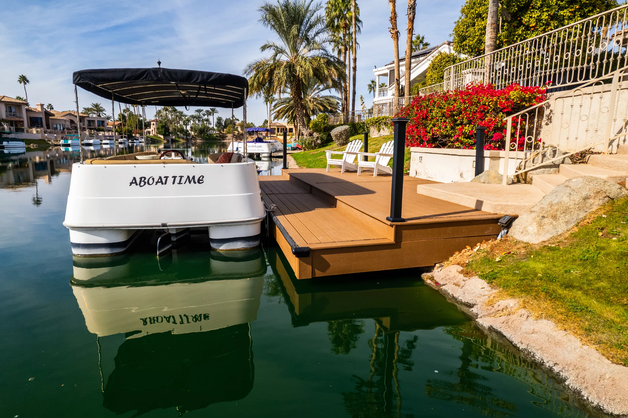 HBC Decks transformed a failing 3-tier dock in Scottsdale Community Ranch into a safe, stylish 2-tier waterfront oasis, enhancing both safety and appeal.