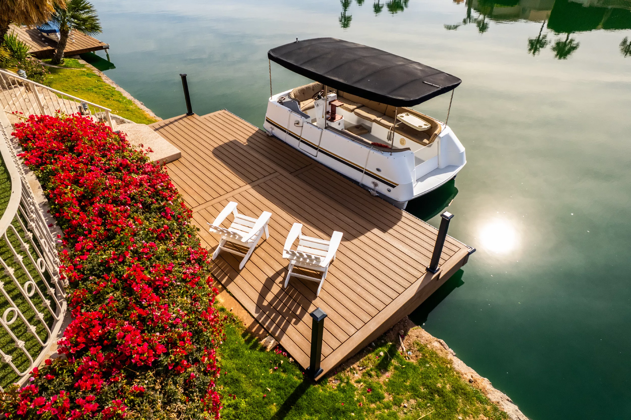 In the Arizona sun, some building products just cannot take the heat. Scott came to us at HBC Decks once he determined his dock had become so unsafe, he was not comfortable standing on it. Wanting to replace and re-design the entire dock, but keep cost effectiveness in mind, we designed and installed a stunning 2-tiered dock made from Trex Enhance Basics Beach Dune, rejuvenating his dock oasis.